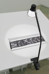 Hybridized of their discrete processes, between systems and grounds is a continuum. In its installation form, Matthusen and Valentine sit at work stations constructed out of white foam core furniture which is lightweight and can be easily assembled and disassembled. Spot lit by desk lamps and connected by lengths of black lace and audio cables, Valentine constructs bobbin lace which generates a data stream of micro-recordings. As her bobbins strike the work surface, Matthusen processes these signals through feedback and delay. As the system performs itself, the textile and sounds also multiply and shift. The textile itself can be played back as a “music box that slowly plays back accumulated recordings triggered by the textile.” The resulting system is an archive not only of this multiplying textile and the sonic feedback from its production, but also of resonant spaces—architectural, environmental, and geographical. Track listings are indexed by date, time, location, and indicate real-time or time-compressed durations as well as ambient sounds. For example, 1. I 07_12_16, 4_00 pm, Rabun Gap, GA (real-time [insects, summer breeze, bobbins, feedback]); 2. II 07_13_16, 11_17 am, Rabun Gap, GA (time-compressed [bobbins, feedback]).