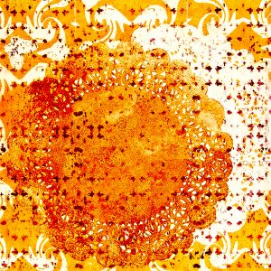 Cherie Blackwell "Suns and Planets No. 3: Jupiter's Transmissions" (2010) 12"x12" Image originated as a print on paper using layers of Solar Plate relief with Akua Intaglio Ink and polyester lithography plates printed with oil-based etching inks combined with chine collé. The print was photographed and then reproduced as both digitally-printed fabric and silk screened prints on fabric. Some of the fabric pieces were over-printed with Pronto Plate using Graphic Chemical etching inks. This technique provided an interesting way to build up unanticipated possibilities for textile designs.