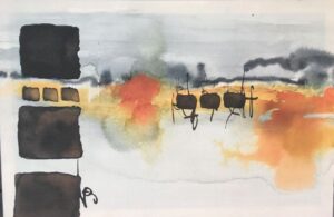 Anni Hunt Barren Lands 2020, ink, oil, gouache, linen canvas, painted, hand and machine stitched, 24” x 36”. Photo by the artist.