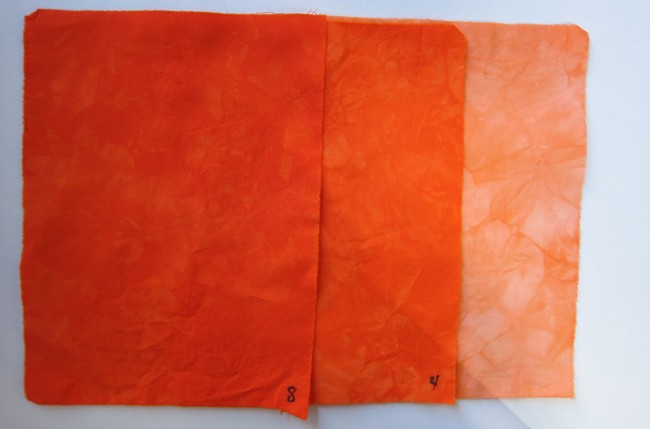 Although I’d been dyeing fabric for about 20 years, I’d mostly done so using volume measurements. As I learned more about Procion dyeing, I became attracted to the idea of dyeing by weight. I could see the many advantages of this method, including the ability to reproduce colors and the cost savings that result from using the correct amount of dye for the amount of fabric being dyed.