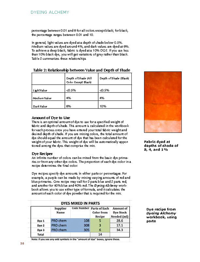 Dyeing Alchemy: An Interactive Workbook removes those fears because it requires that the dyer enter only the fabric weight, desired depth of shade and possibly a color mixing formula. Once that is done, everything else is automatically calculated.