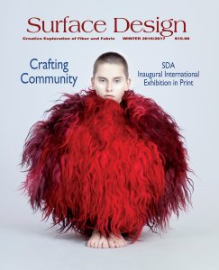 Crafting Community: SDA Inaugural International Exhibition In Print received 412 entries from 13 countries, revealing the global reach of the SDA community. Jurors Mark Newport and Marci Rae McDade selected 40 artists in honor of SDA’s upcoming 40th Anniversary, 8 of which being award winners. The artists featured in the Journal are a wonderful variety of material exploration and concepts—a showcase of this contemporary moment in fibers, textile media, and surface design.