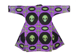 Dilyara Kaipova, Alien Invaders Robe, 2018. Ikat cotton fabric designed by the artist and handmade in collaboration with a weaving workshop in Margilan, Uzbekistan.