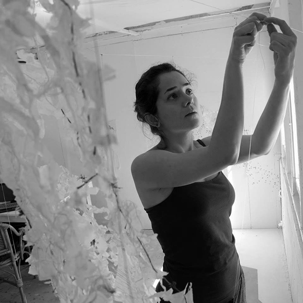 Using materials that would otherwise end up in landfills, artist Natalya Khorover draws inspiration from urban environments and nature. She meticulously hand-stitches and mends vintage linen alongside translucent single-use plastics to render these materials unrecognizable. Her collaged pieces have been exhibited throughout the United States. In addition to her art practice, Natalya works as an educator and material consultant for other artists who are struggling to achieve their creative visions.