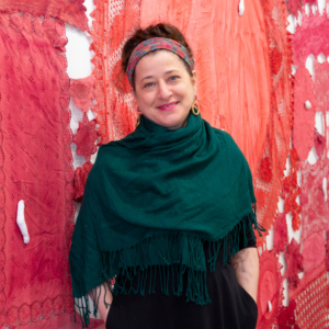 Jess Jones (she/her) is a textile artist and Associate Professor of Textiles at Georgia State University in Atlanta, Georgia as well as Affiliate Faculty with the Institute of Women, Gender and Sexuality Studies. Jones’s work examines psycho-geography, textiles’ relationship to the urban environment, and the creation of digitally derived layered and stitched compositions. Her series, Weeping Quilts, can currently be seen at the Momentum Gallery in Asheville, NC.