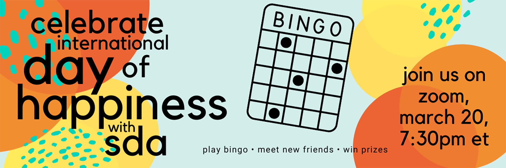 Let’s play! Join us on Zoom for SDA’s Happiness Bingo Play two rounds of specially customized SDA Bingo PLUS mingle in the Intermission Party Rooms. Fun fact – March 20th is the UN International Day of Happiness and the first day of spring during the year of the Rabbit in the Chinese zodiac.