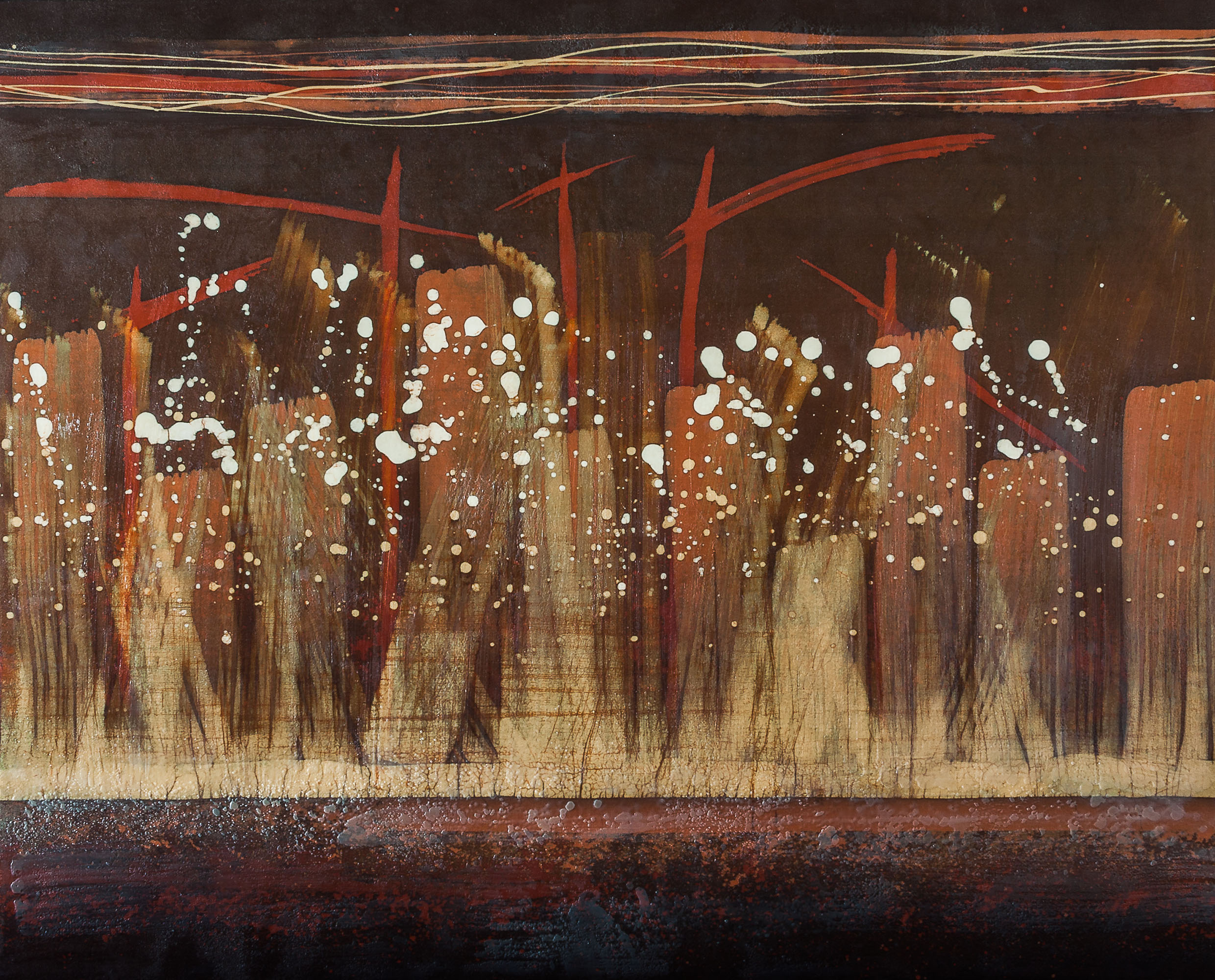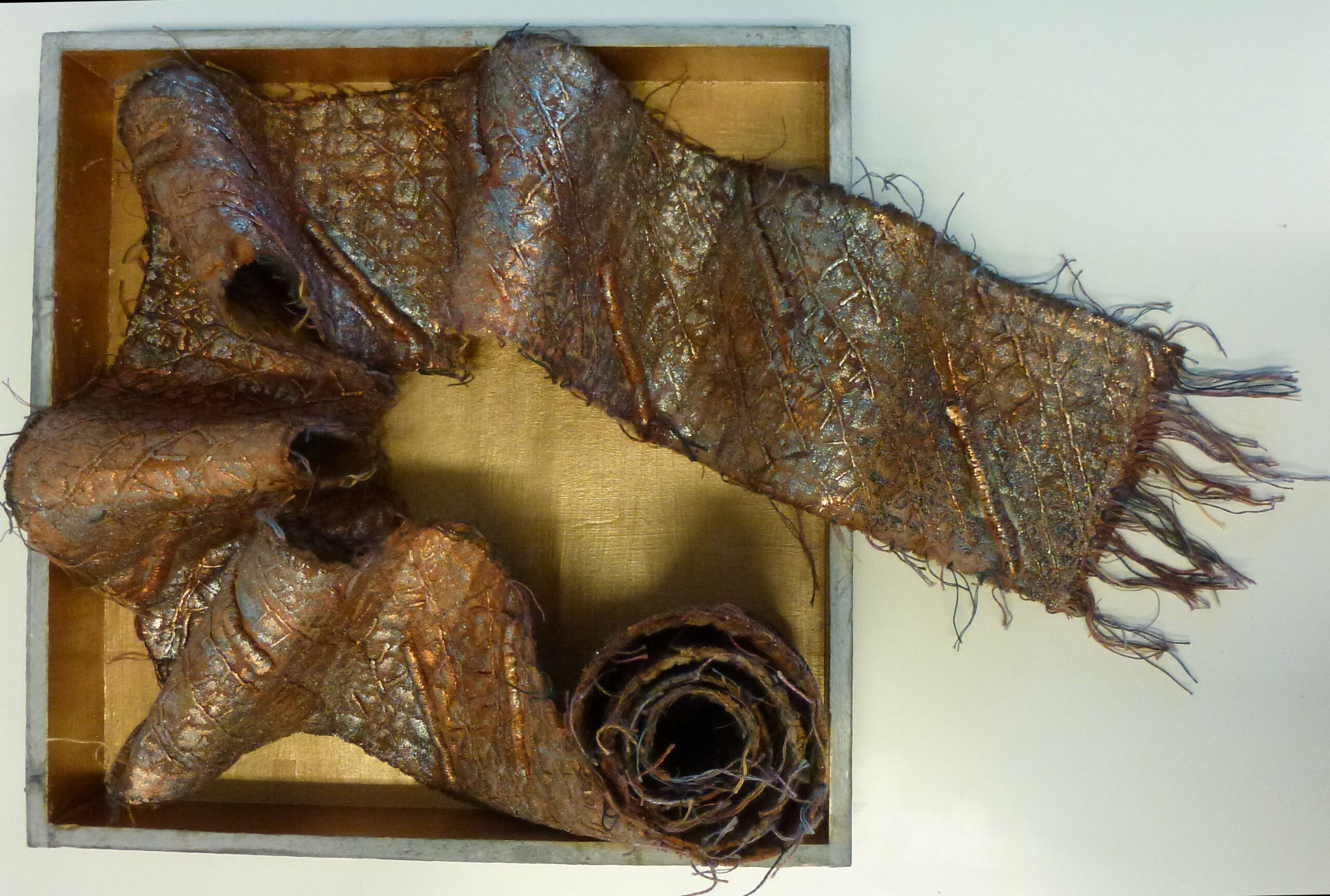 Batik, collage burned out or cut; Linen, batiste, gold pigments, iron sticks (60 x 92cm)