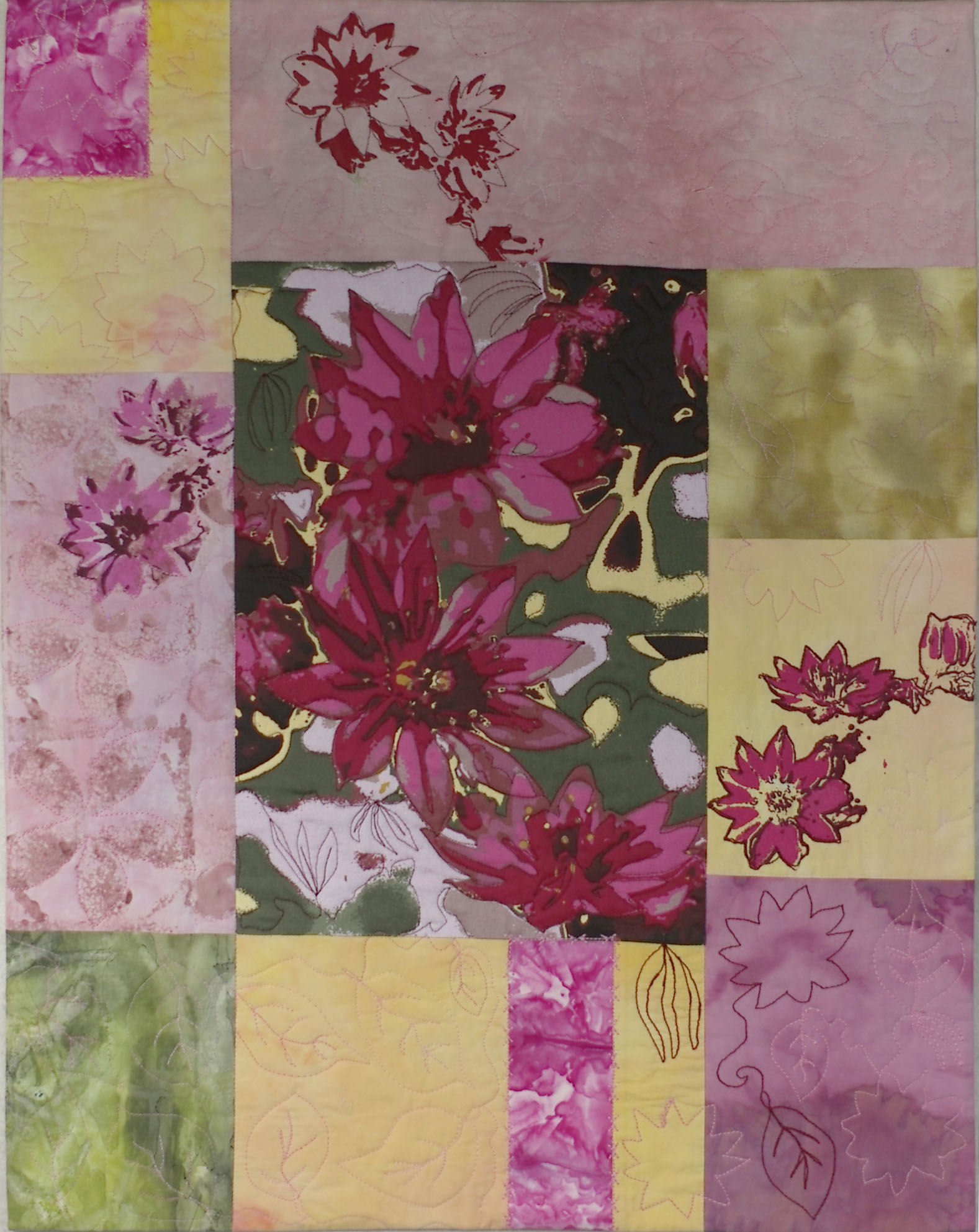 Stamping, thermofax screen printing, digital alteration of photos, ice-cube and low-water immersion dyeing, free motion quilting; cotton and commercial fabric, fiber reactive dyes, acrylic paint, bamboo/silk/cotton batting (66 x 53cm)
