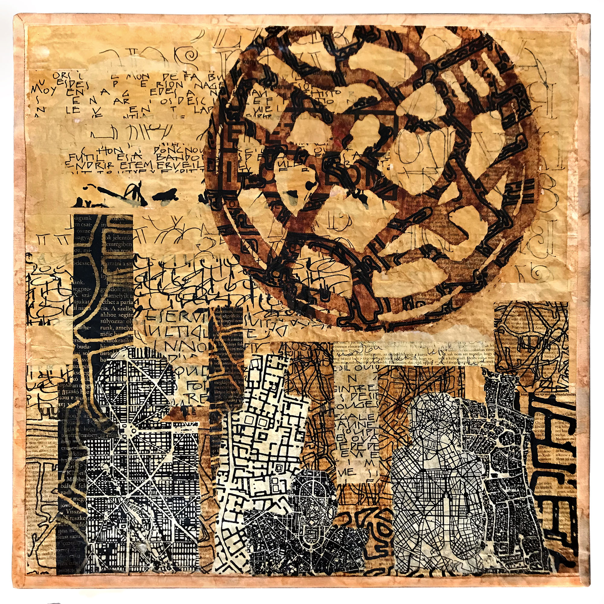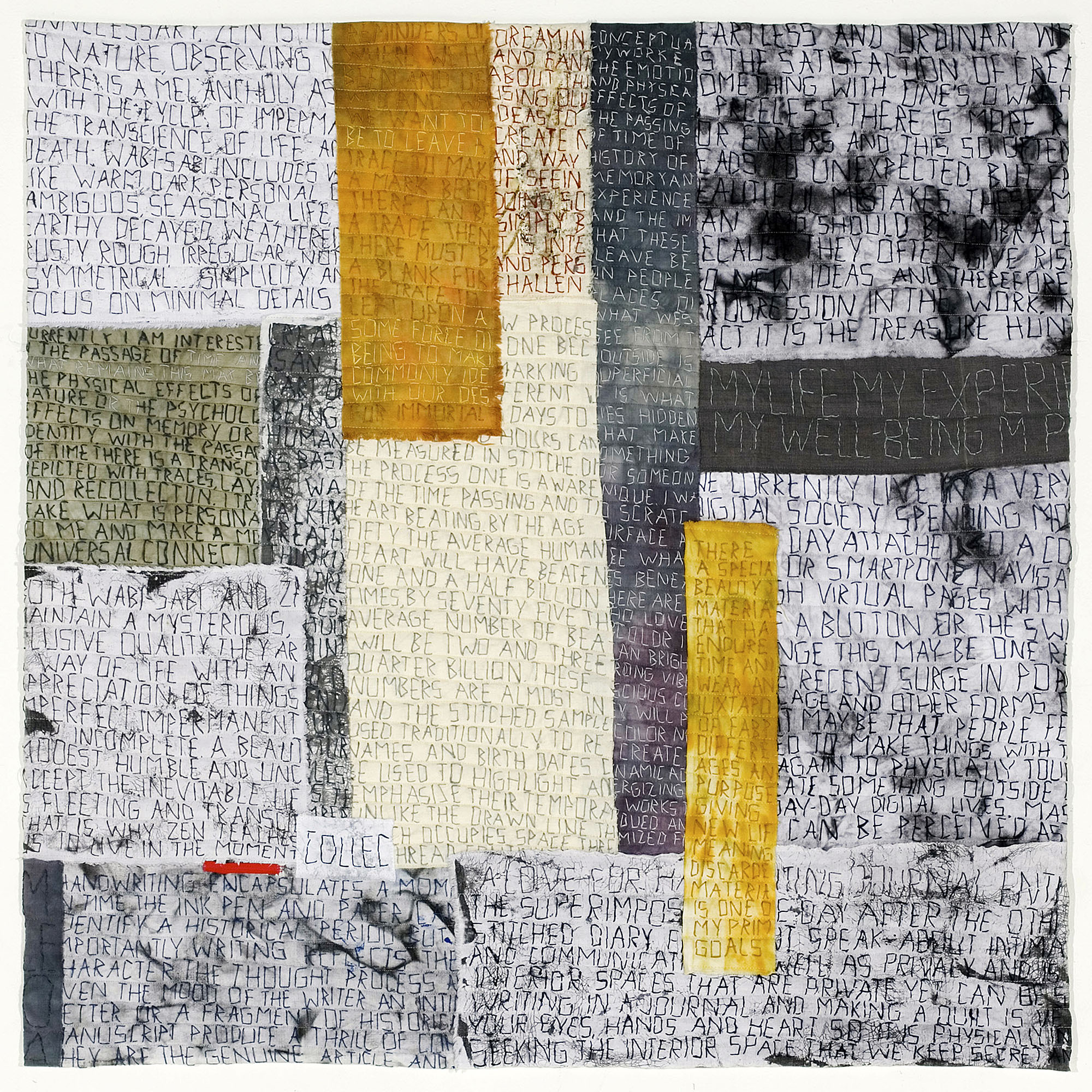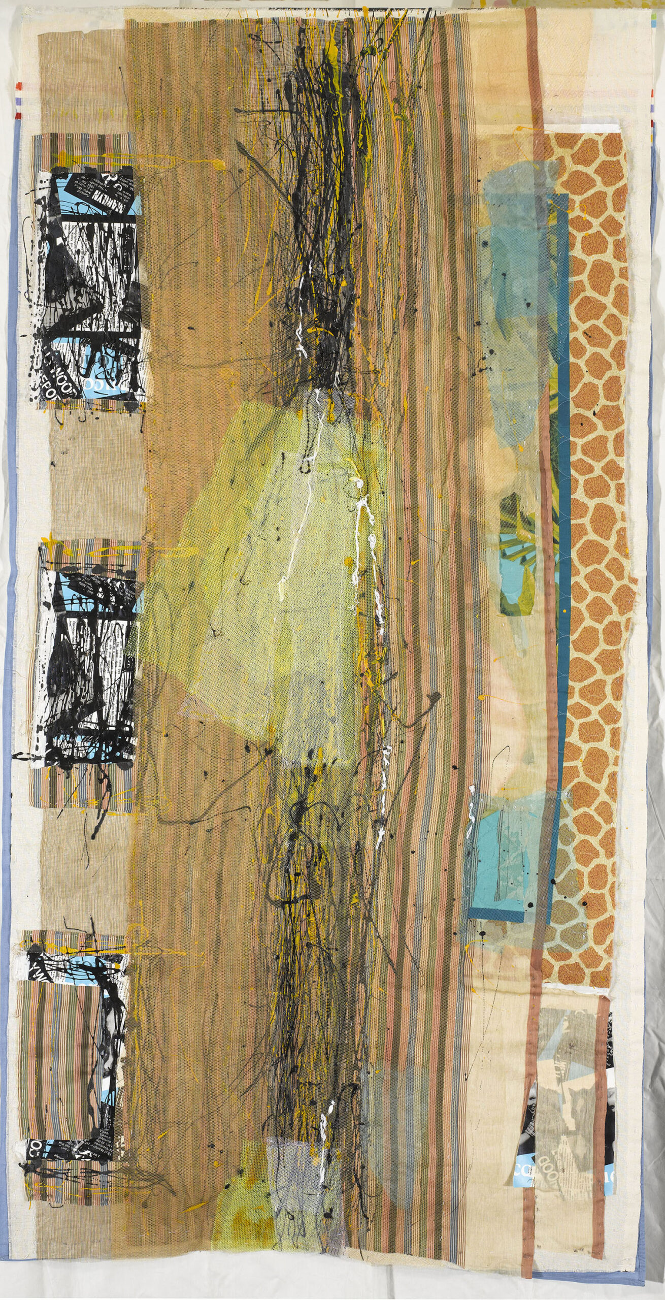 Collage using old quilt, overprinted, dyed newspaper, glue (50 x 50 cm)