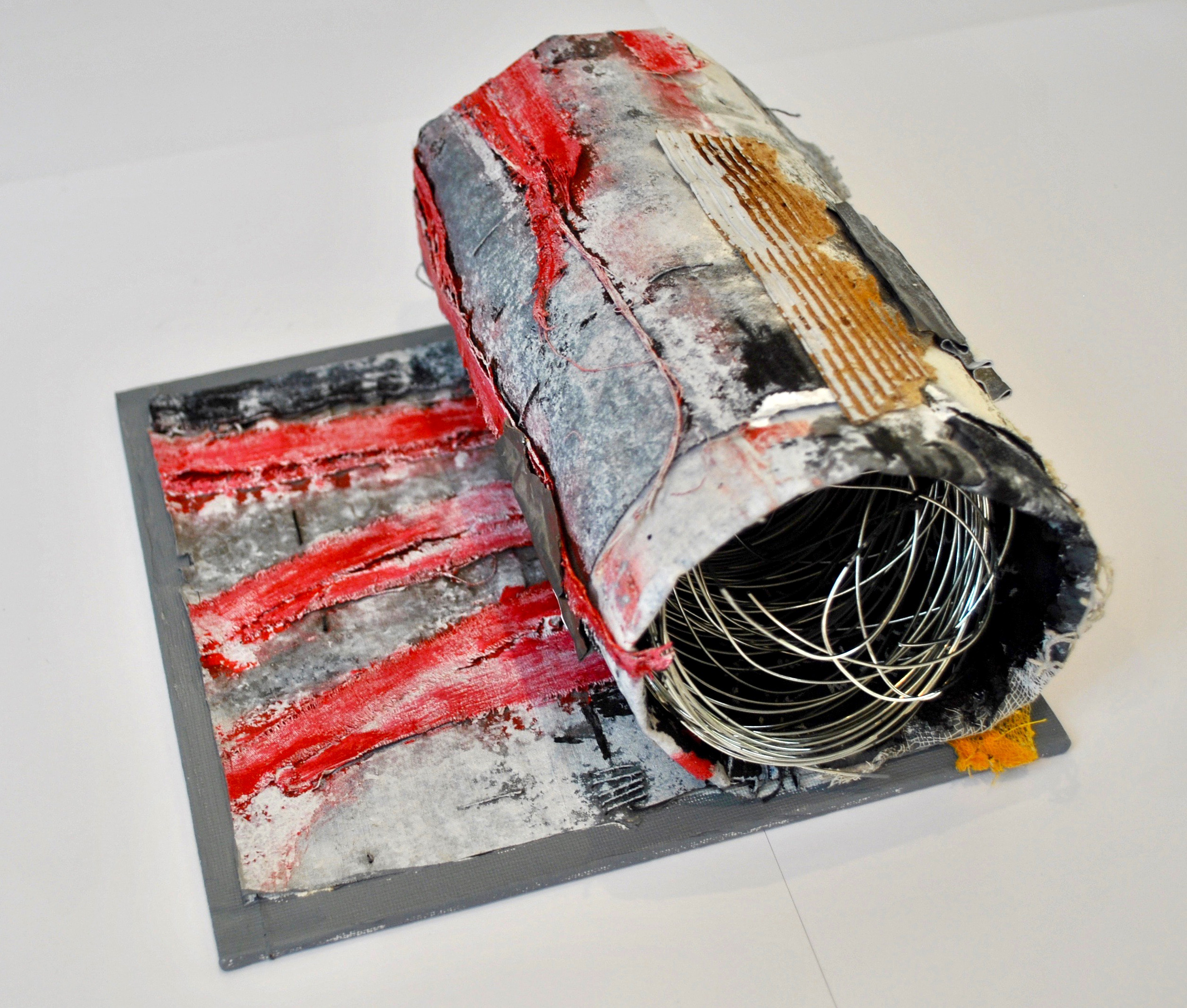 Hand stitching, painting; cotton, paint, card, net, flashing, wire (20 x 20 x 11cm)