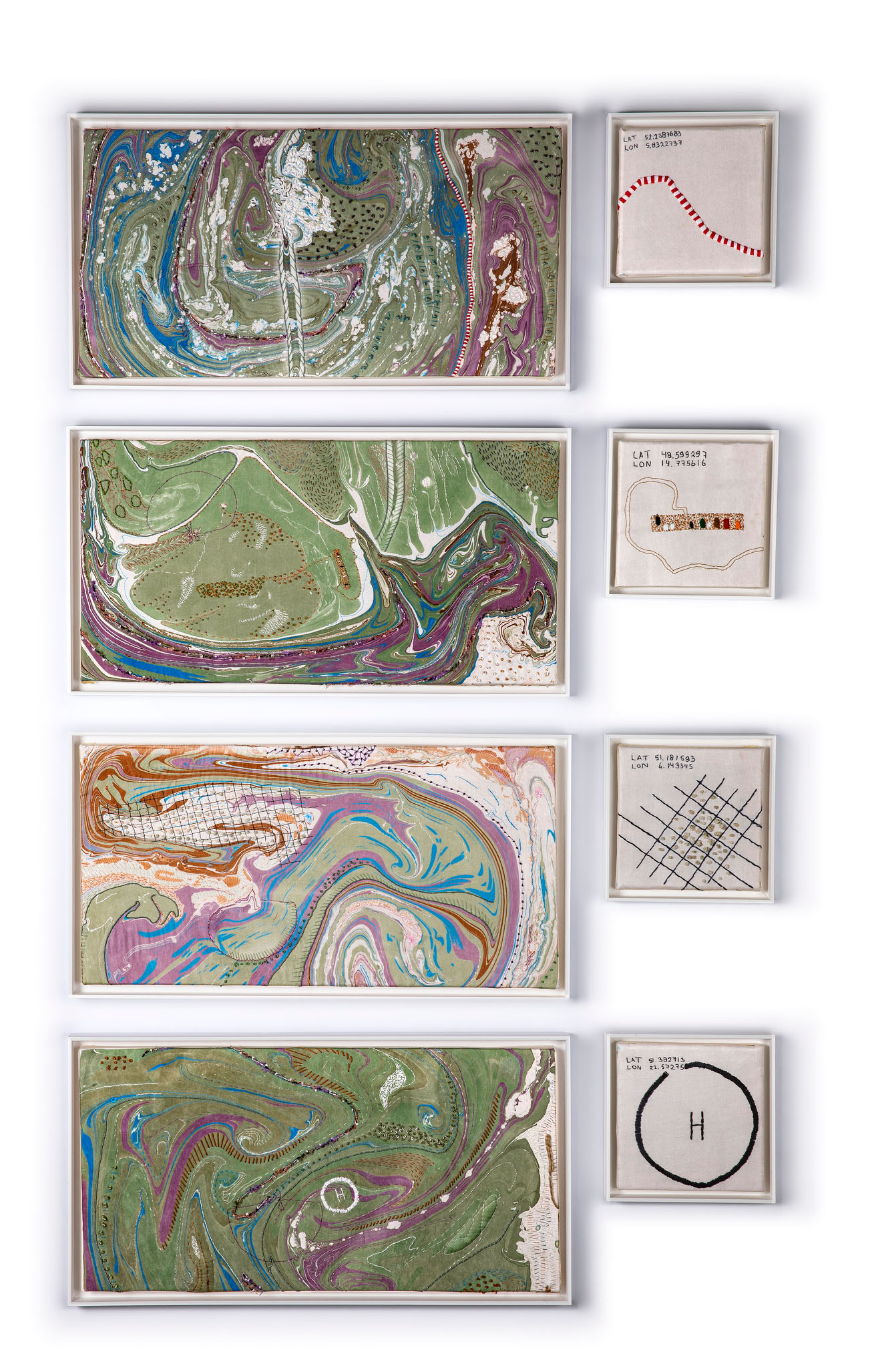 Marbling, hand embroidery; silk, linen, marbling dye, threads. Four landscape views, shot from a drone, of several European countries along the same Longitude line, with human activities on the ground showing fugitive shelter, a helicopter platform, a parking lot in the middle of nowhere and an imaginary border. (160 x 100cm)