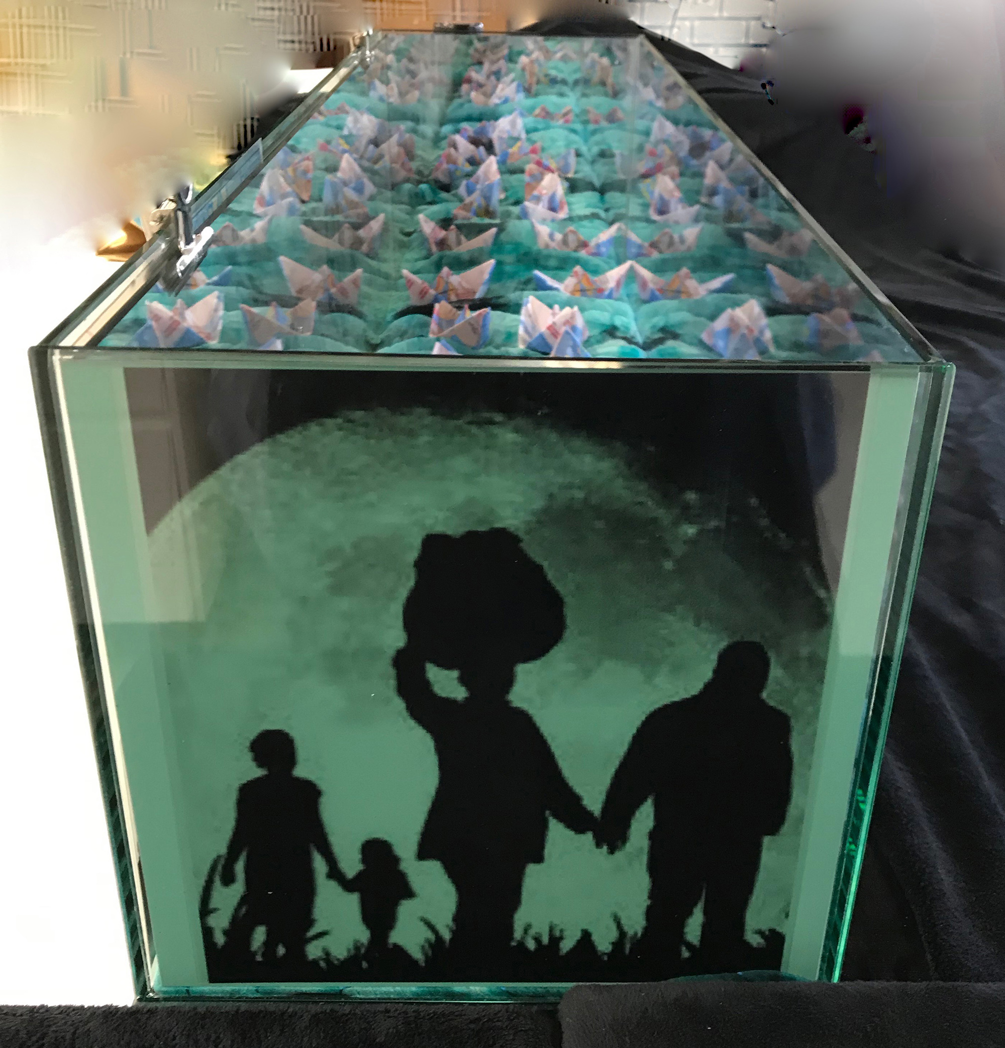 Shibori, encaustic; organza, paper, wax, glass (25 x 25 x 90cm)