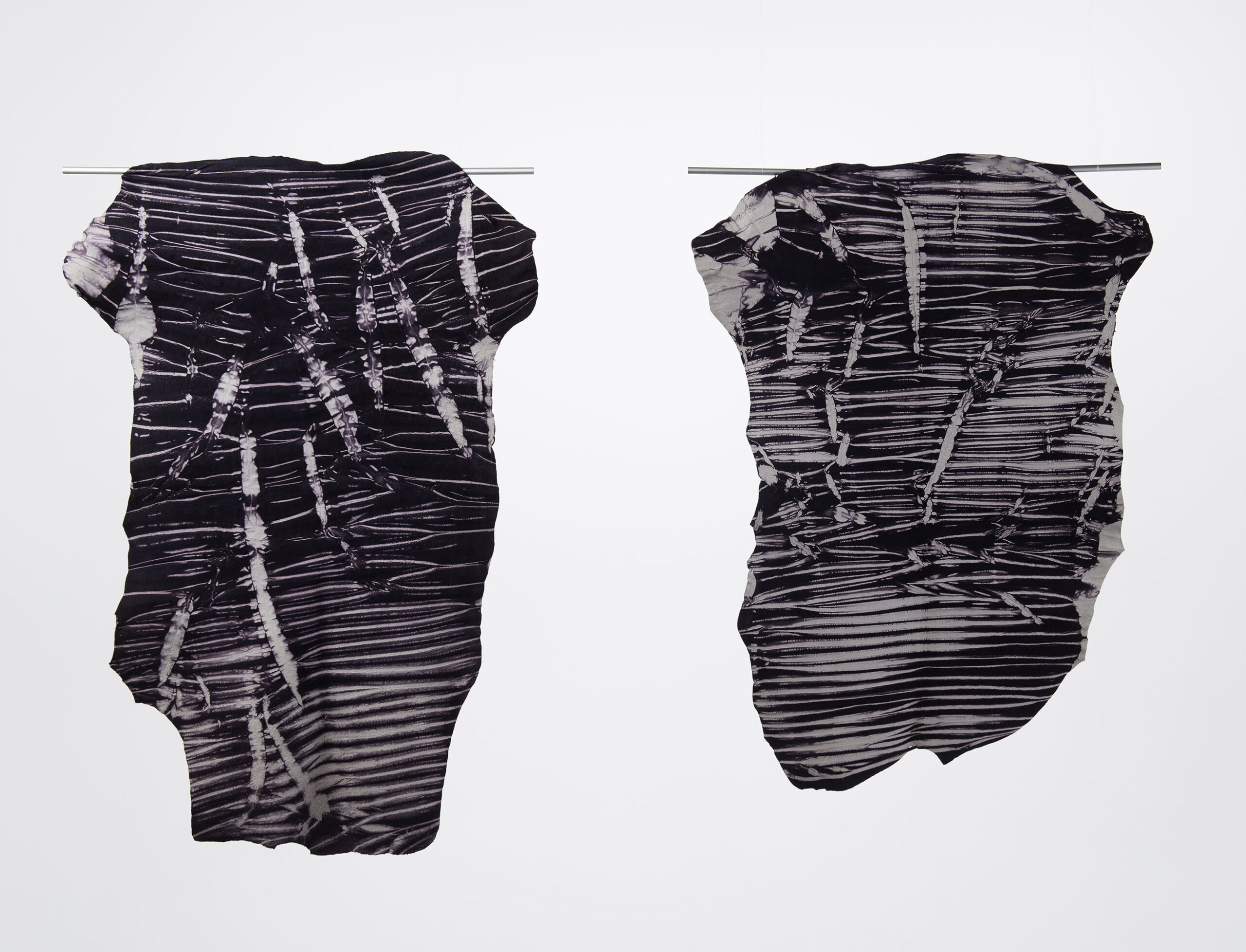 Arashi Shibori, acid dyes on pig skin (84 x 55cm)