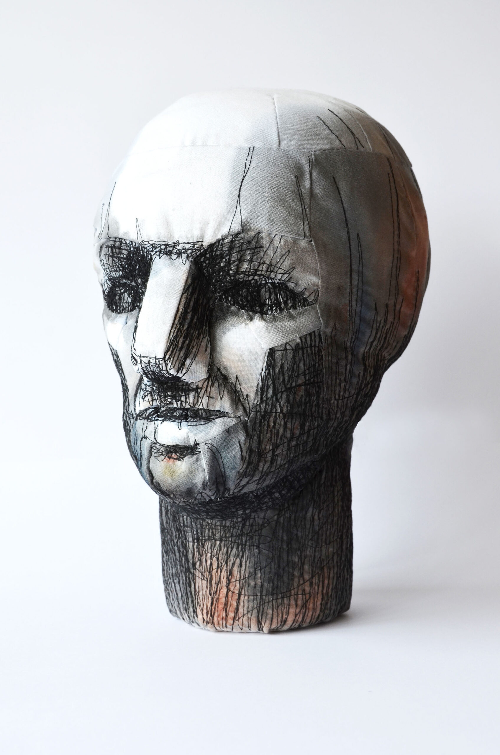 "Embroidery, stitching, painting, using cotton, inktense pencils, fiberfill, plastic, cardboard, pebbles, glue (29 x 18 x 22 cm)"