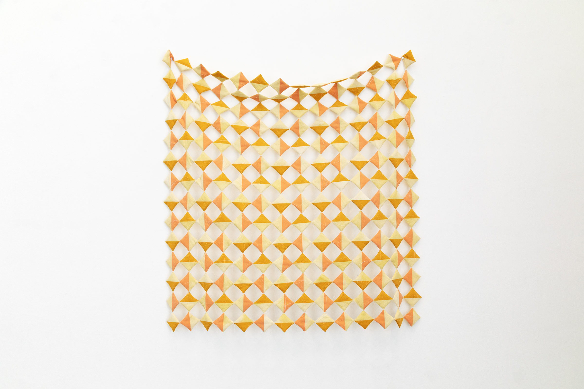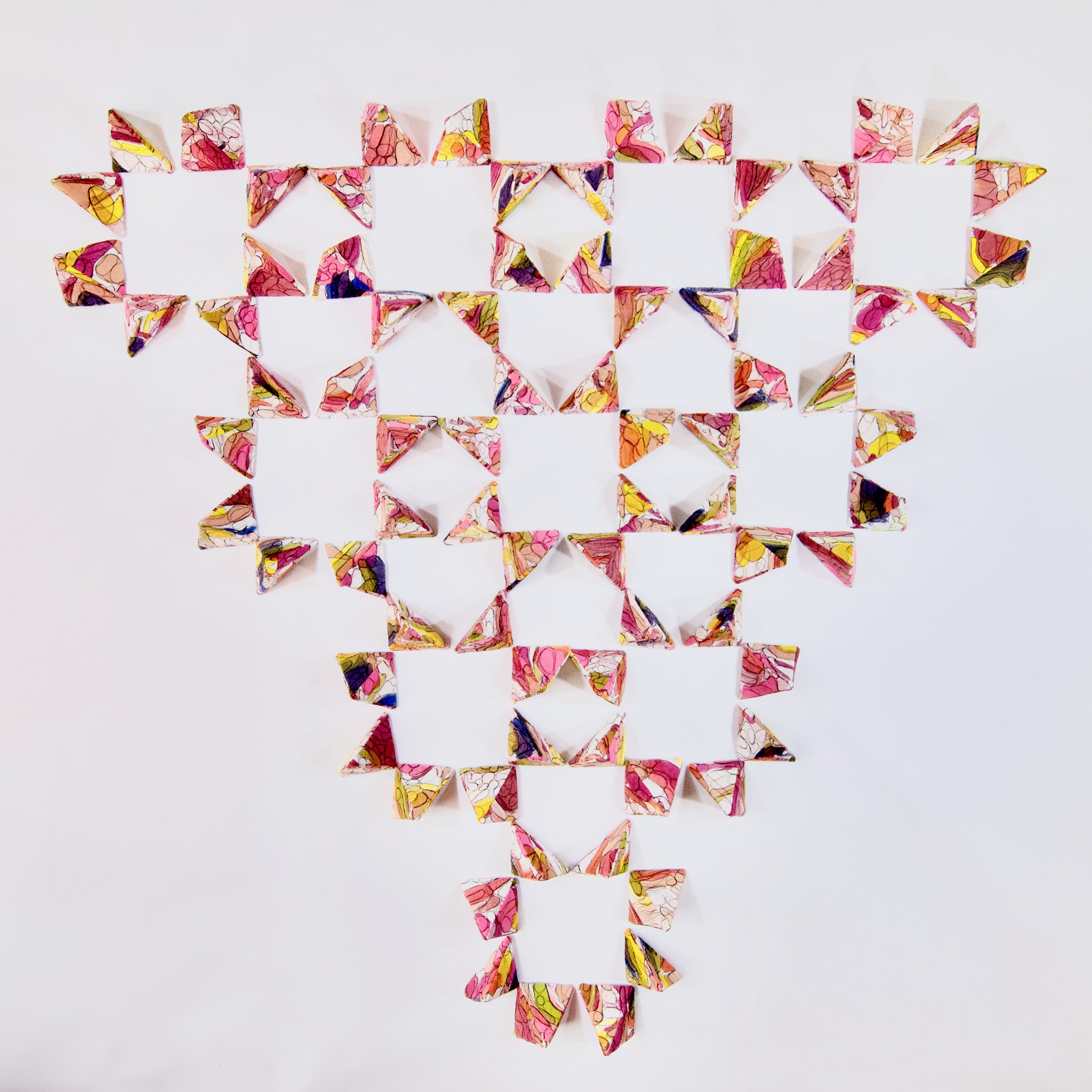 Quilt tiles that are individually stuffed with batting and backed connected at corners with knotted thread, dandelion dyed fabric is the pale yellow fabric, when folded diagonally the squares hanging to the back can be seen through the negative space between the squares in front.