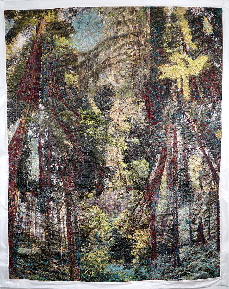 Thread on layered fabric, free-cut and free-stitched by machine [29" x 29"]