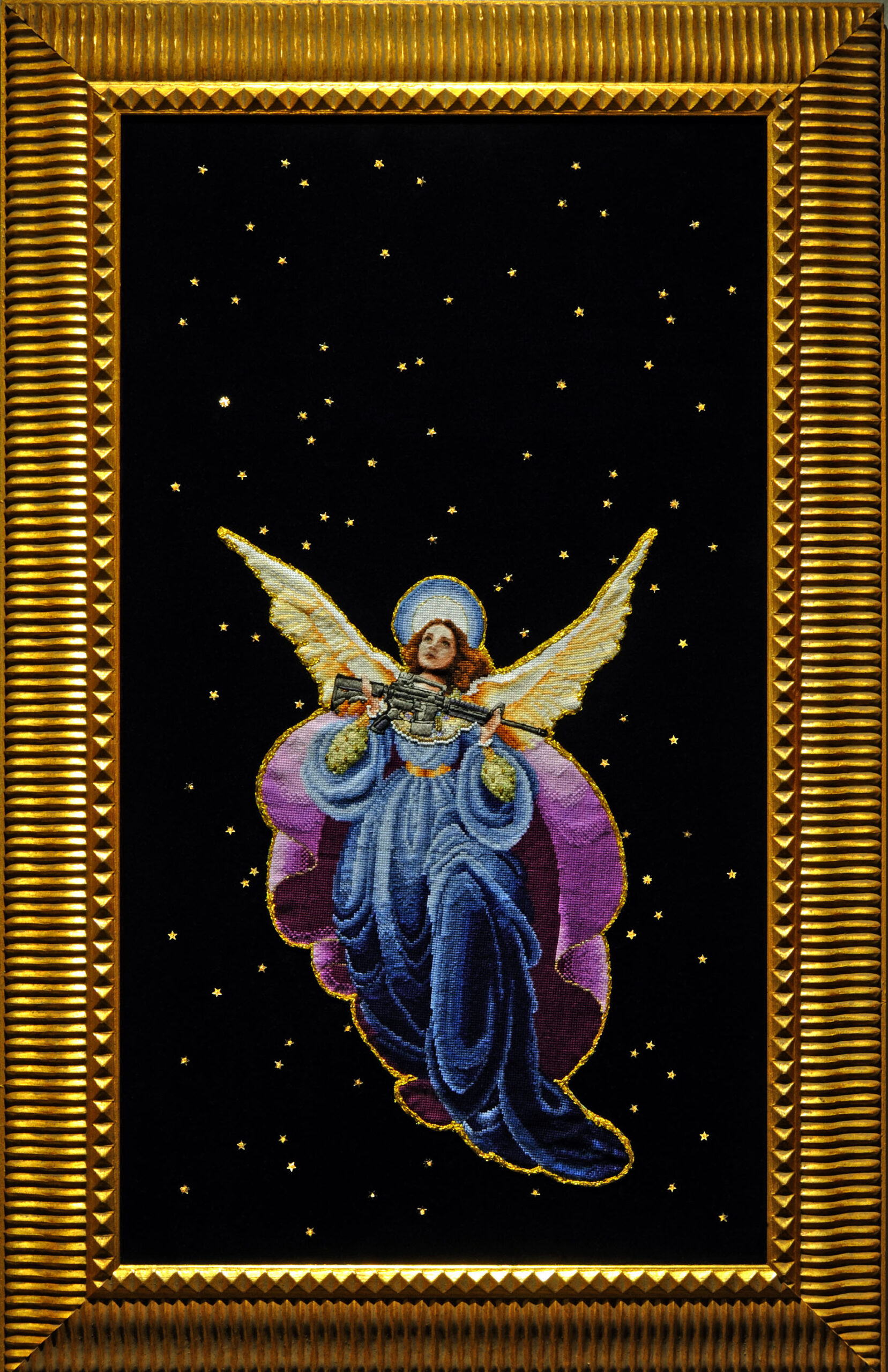 hand embroidery on found deconstructed cross stitch, gold thread, 96 beads & star sequins (one for every gun death per day in the U.S.), blue cotton velvet [28" x 16"]