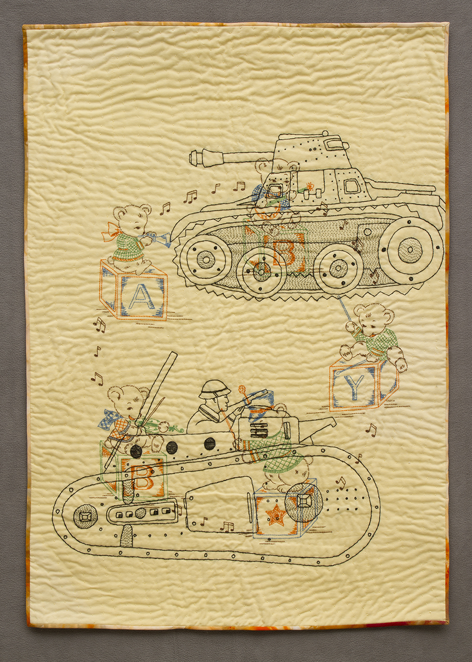 American Childhood is the term I use for this series of quilts which start with Mid Century baby blankets collected on the internet. I’m looking at several things here and one is the huge contrast between the cute and sweet images we insulate infants with and the violent reality we are surrounded with as adults. Many show a cute and fuzzy world of baby animals that can insulate us from the from the harsher realities of the wild. Some tourists have learned the hard way that those are not teddy bears out there. Other baby blankets show babies and children engaged in idealized, sex role appropriate activities in an idealized picture of childhood that was completely unattainable for many.