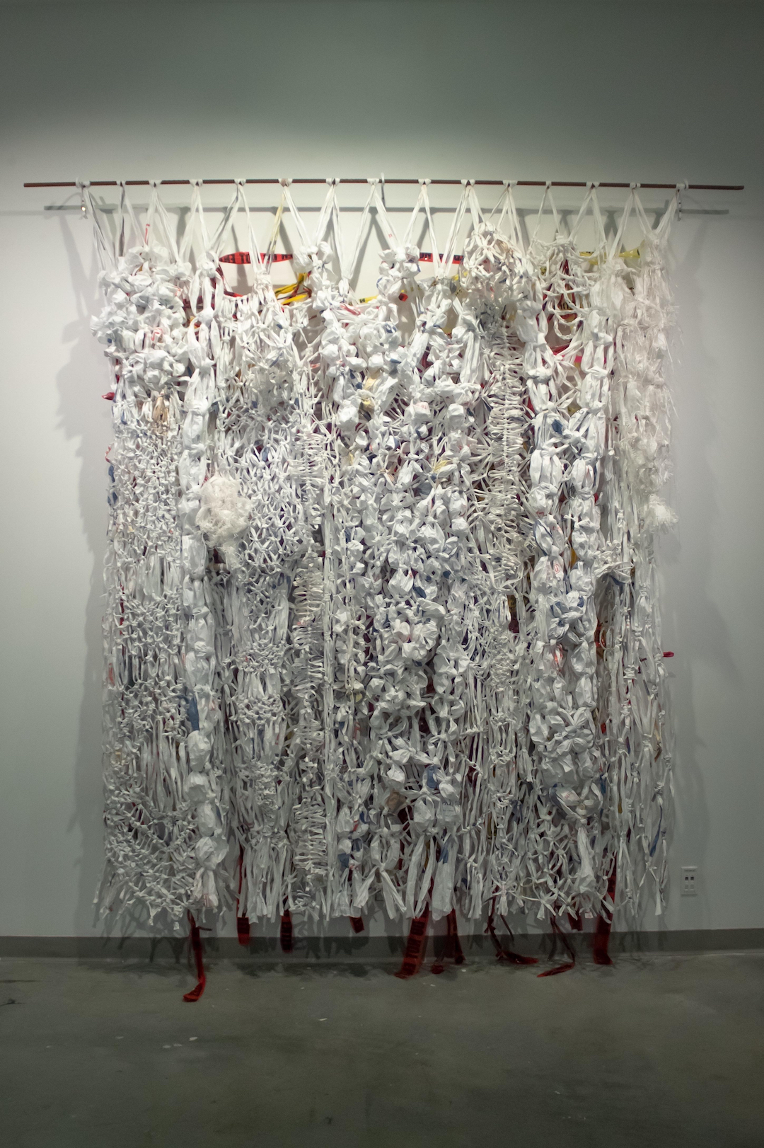 Found Tyvek spun polyester building wrap, construction-site detritus, rebar [120"W x 120"H x 8"D]