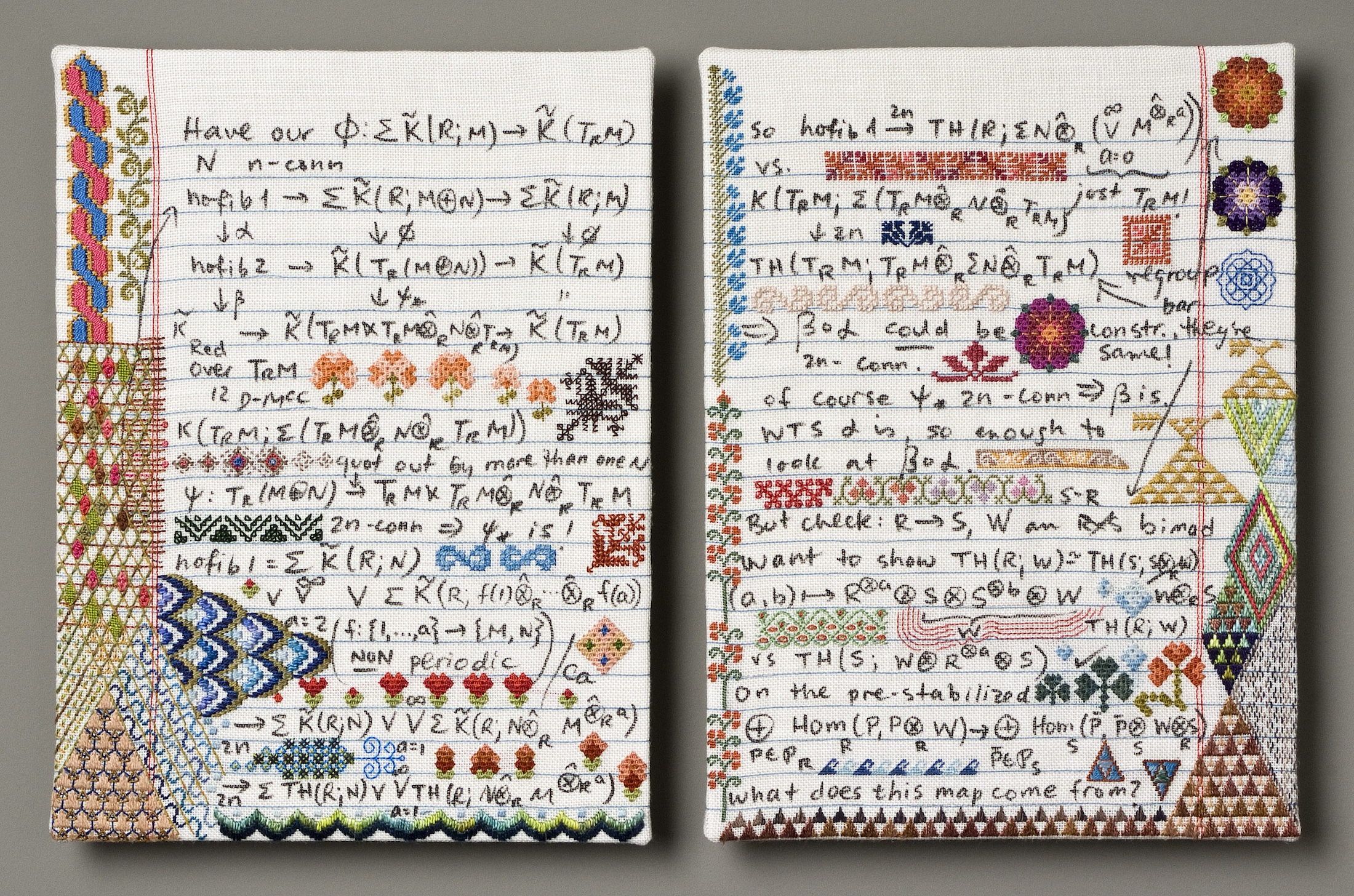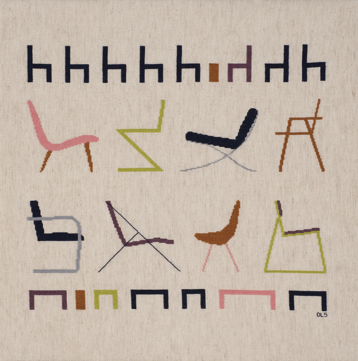 More than anything else, classic modern chairs evoke for me my childhood home, which was filled with Mexican Bauhaus furniture collected by my parents, an architect and a weaver. My favorite was the loveseat, in which I spent hundreds of hours reading. “Modern Chair Sampler” includes chairs I grew up with, chairs from my own home, and others whose shapes I love. Some of the hours I spent in the Bauhaus loveseat were probably taken up by cross stitching, which I taught myself from the Girl Scout Handbook. Now I use cross stitch to play with traditional sampler forms, express myself politically, and bring concepts of modern abstract art into the world of needle and thread.