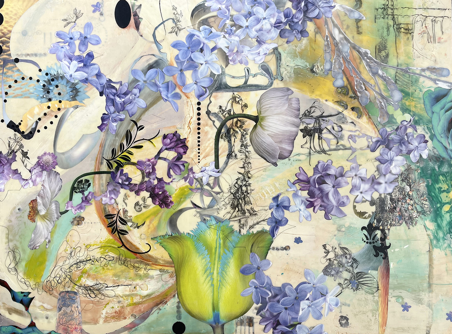 Encaustic, collage, mixed media on stained silk on wood [30" x 40"]