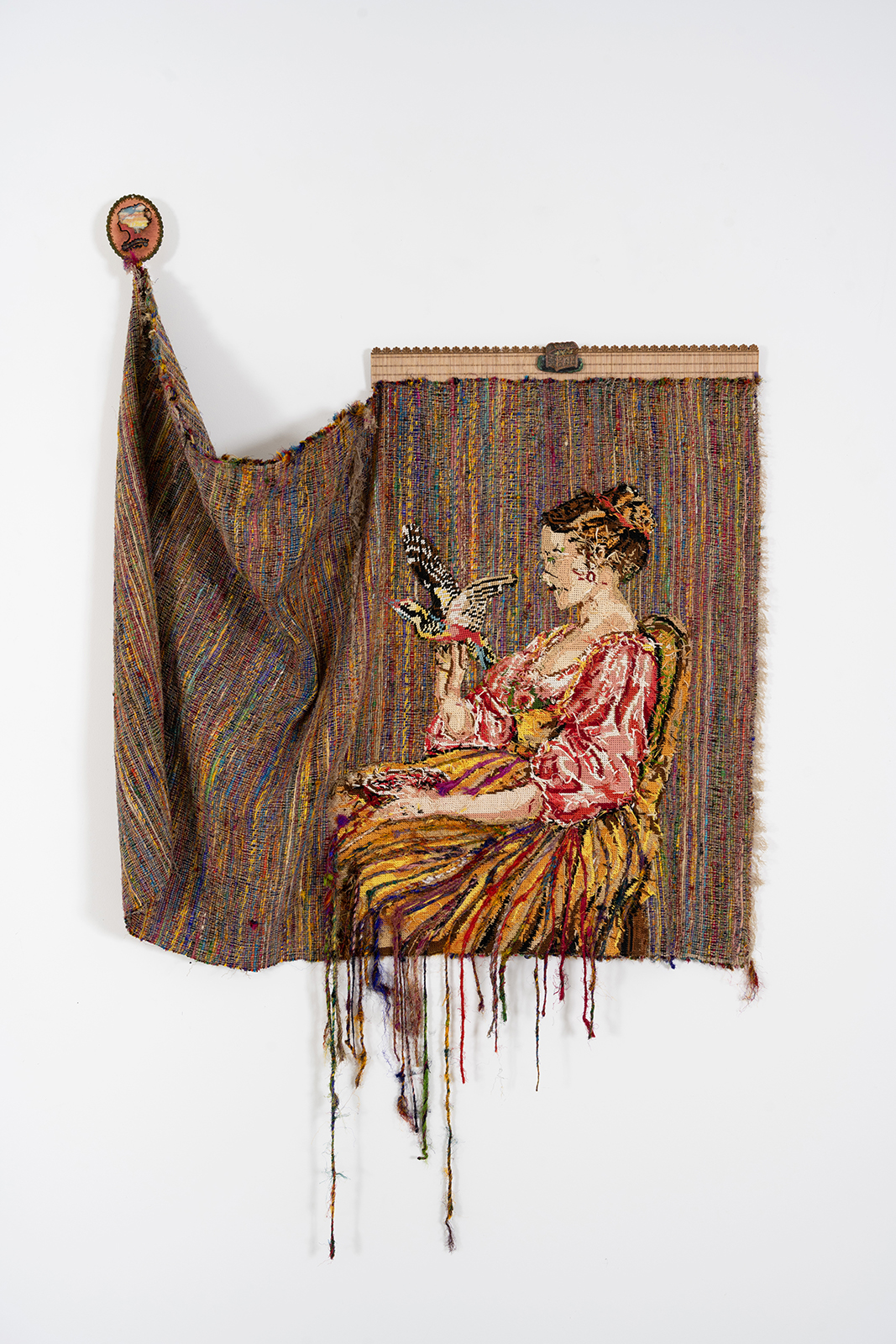I was a weaver first. Although it is not my regular practice now, I wanted to nod to my historical background, as well as the background of this art, itself. Punch cards gave birth to the technology today that allows me to use alternative materials and methods. The wooden cameo and band that the weaving hangs from are made of wood and engraved on a Glowforge laser cutter. I really enjoy melding the old with the new. And here, nature melds with human; we must love and value our world, but be ready to let it fly on its own, too.