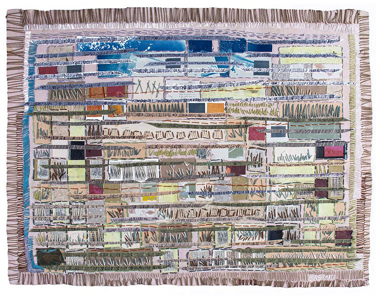 Archival pigment prints on kozo paper, thread, paper maps, iridescent water color [62" x 50"]