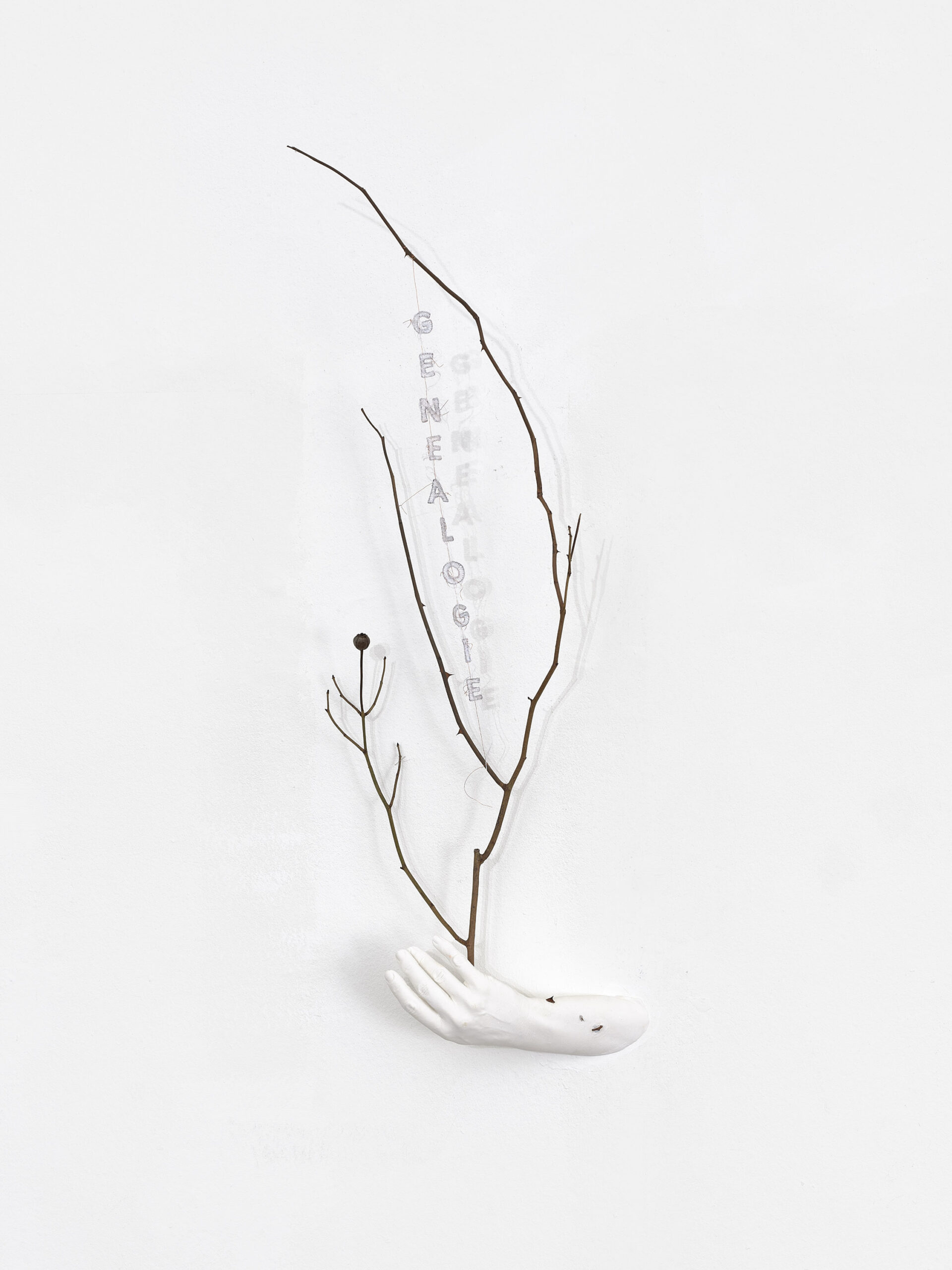 I embroidered the word GENEALOGIE with white cotton thread onto two copper wires. It unfolds vertically, resembling a fragile spine. Connected to a dried rose branch, this structure highlights a genealogy that extends beyond the human sphere to root itself in nature. The rose branch, fragile yet persistent, embodies the biological and symbolic roots that link humanity to its environment. A "vegetal memory" is inscribed within humanity – a silent yet omnipresent memory. From foundational myths to everyday practices, plants nourish, heal, and inspire, becoming vectors for the transmission of knowledge. The cotton thread, of plant origin, becomes the material support for a textile writing that narrates this continuity between humanity and nature, with each sewn stitch preserving a fragment of this shared memory.