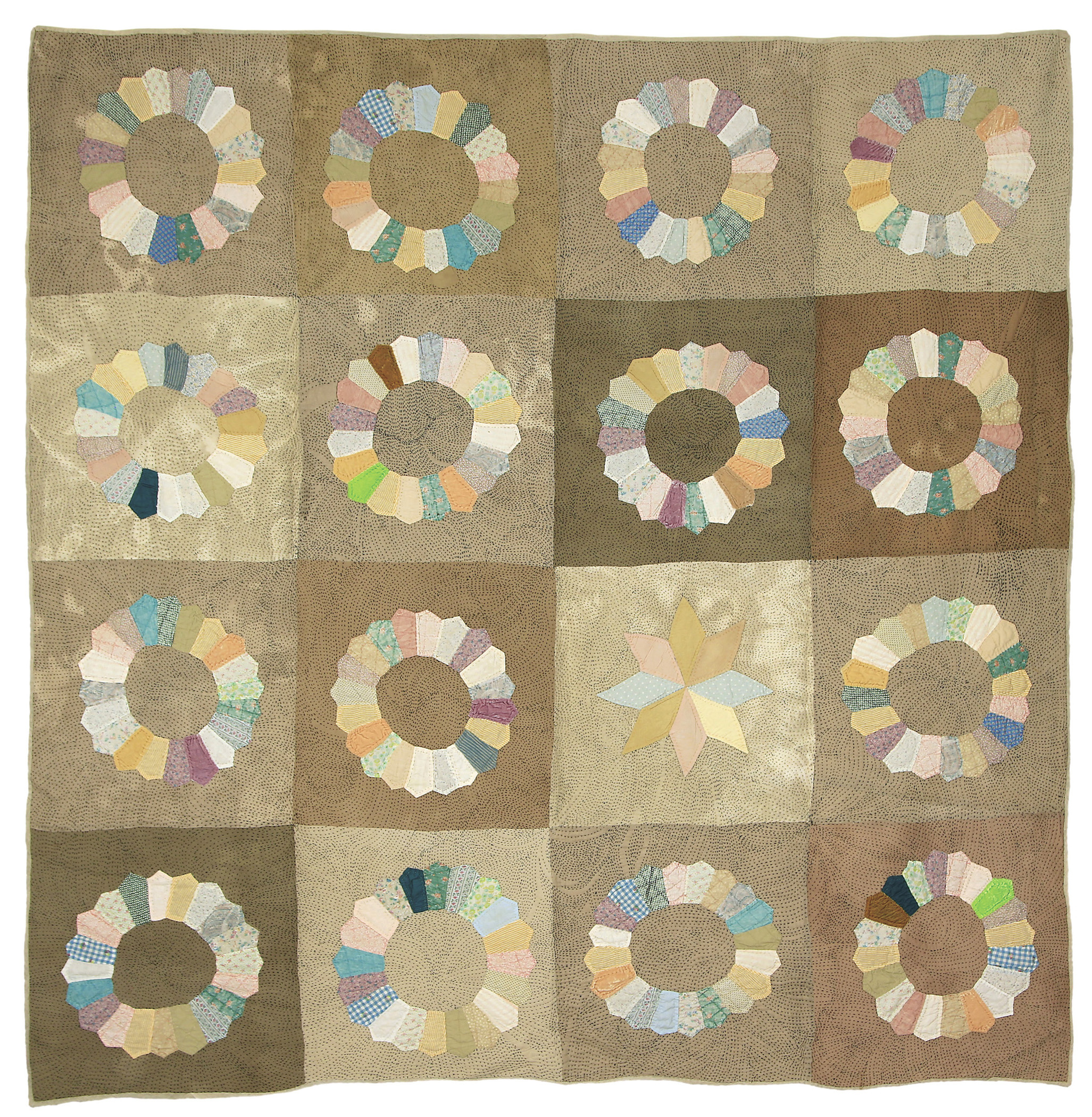 vintage quilt patches (dresden plates) some of them mended with velvet, wool fabric dyed with plant dyes, cotton and wool threads, wool batt, vintage damask back cloth [227cm x 227 cm]