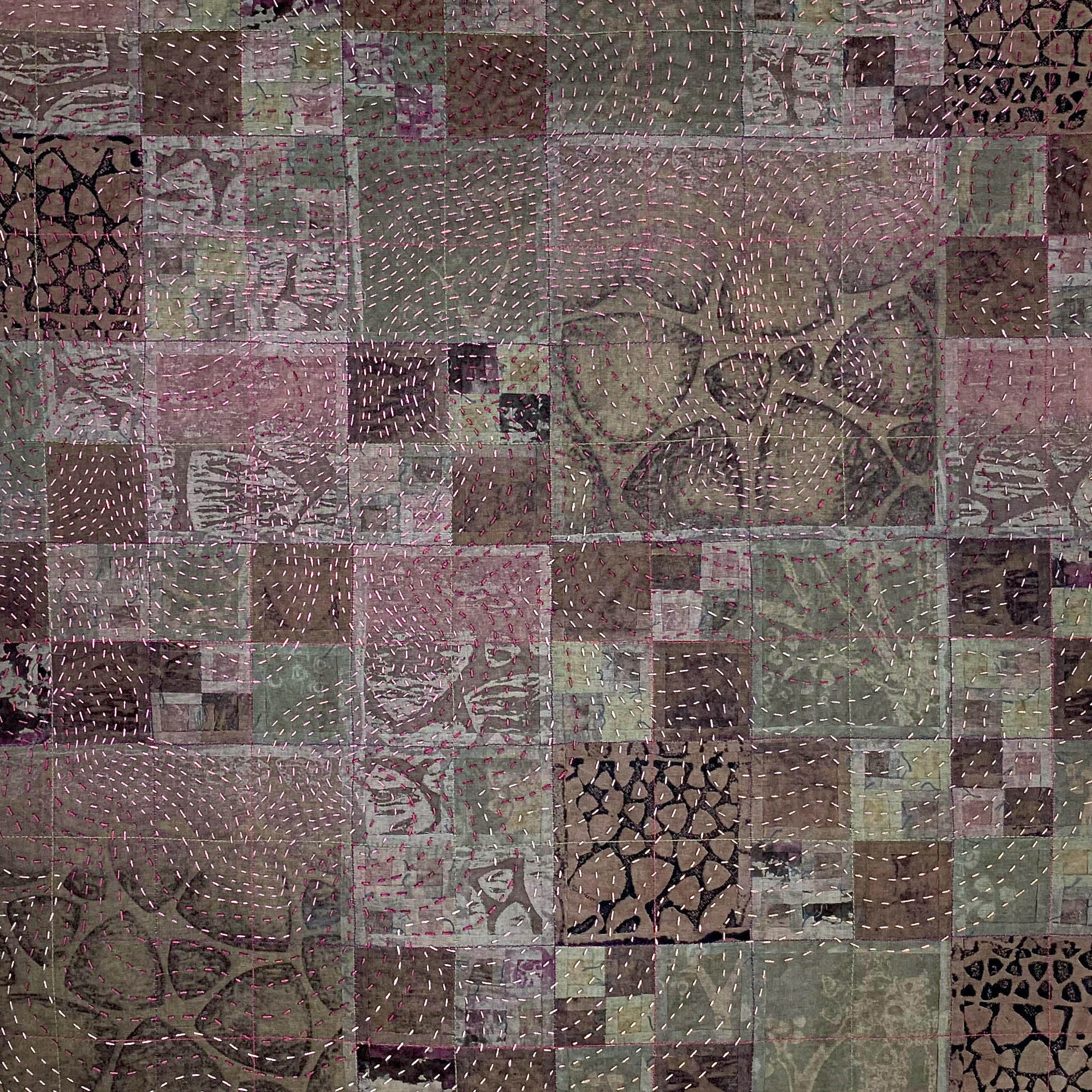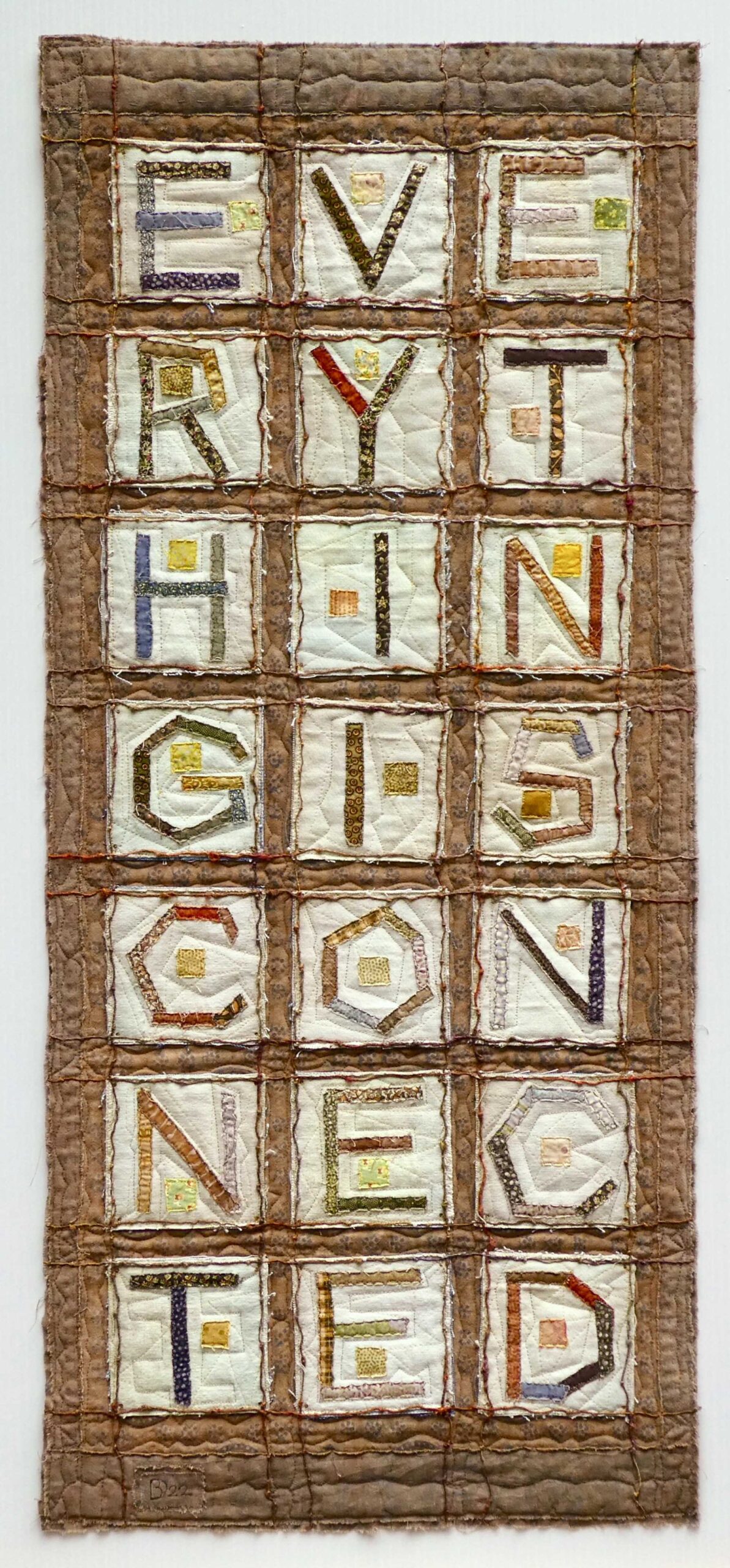 "When I think of ‘connection’, I think of the way all life is intricately connected. Every living thing depends on every other living thing. When enough of these connections are broken, the whole cannot survive. The letters forming the words 'Everything is Connected' on this piece, were stitched separately on 4” x 4” squares of canvas and nailed outdoors to my fence in 2019. After they'd weathered for 18 months, I took them down and re-purposed them to make this piece. "