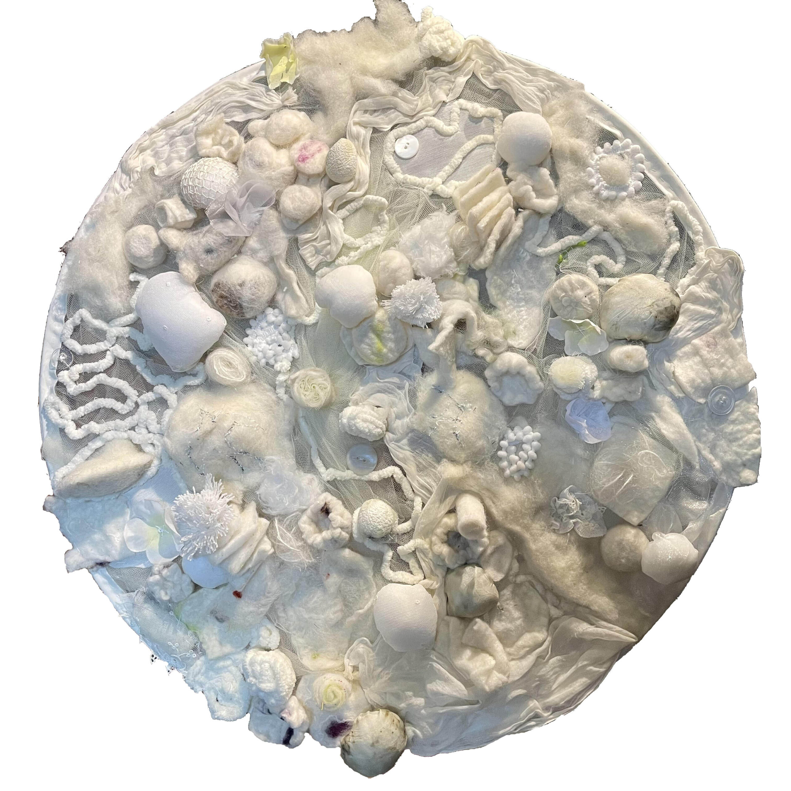 Wire, netting, felted wool, threads, yarn, muslin, silk, buttons (20" diameter x 1")
