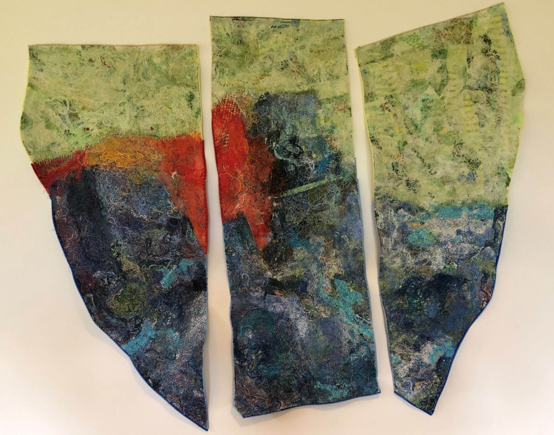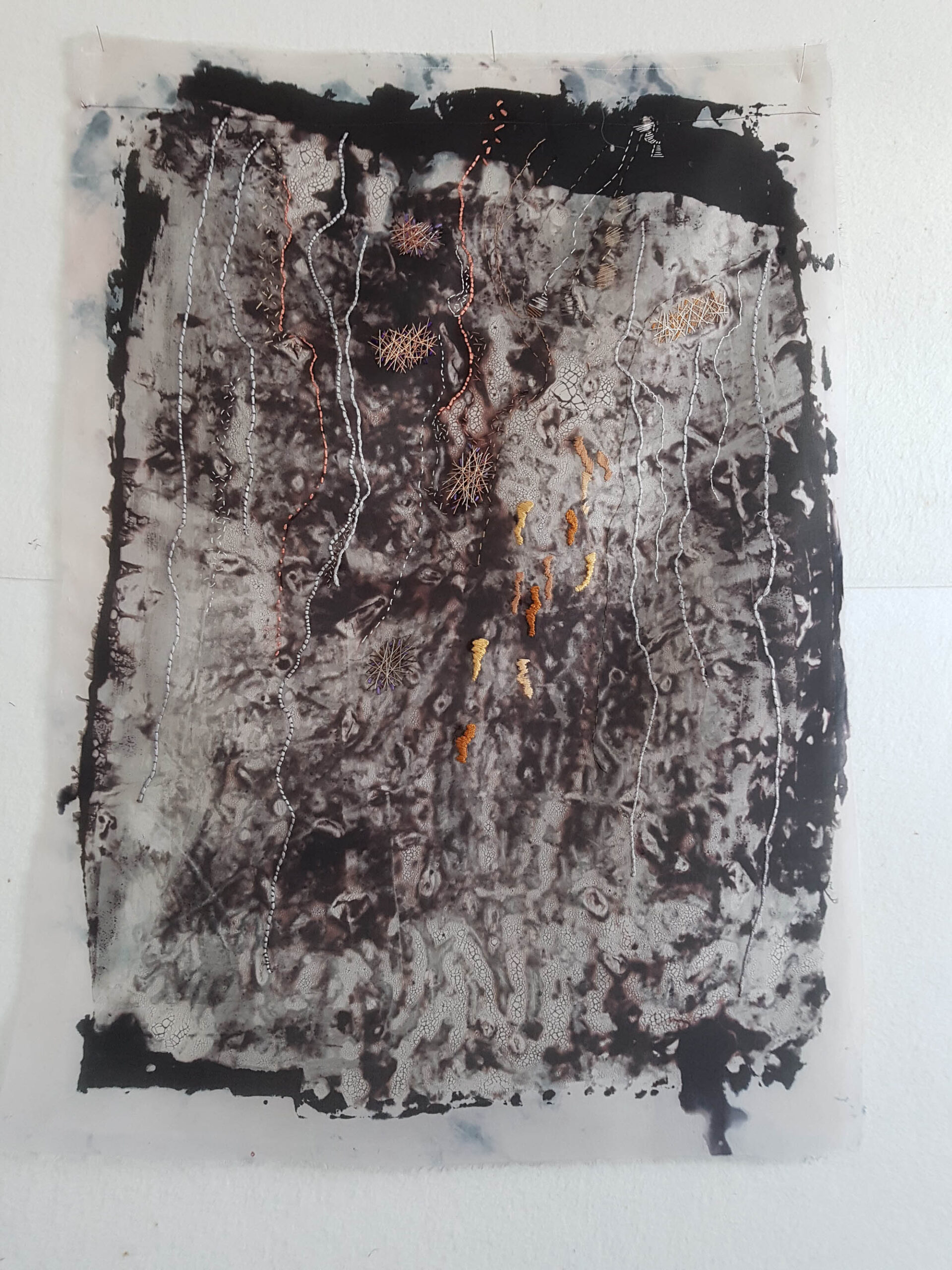 In my studio I found some silk panels which I had dyed. During the pandemic I started stitching on them and was struck how they reminded me of scarred skin. The hand stitches resembled suture lines which had healed over and left a scar. This reference to trauma and healing was a fitting image as I felt bruised and scarred by the experience of isolation during this difficult time.