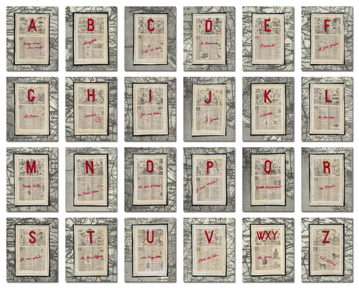 I wanted to brush up on my French before travelling to France. After a refresher course at University, I created these pieces using twenty-four French Larousse dictionary illustrations, printed them on cloth and embroidered conversational sentences on the cloth pages. They are adhered to cradleboards.