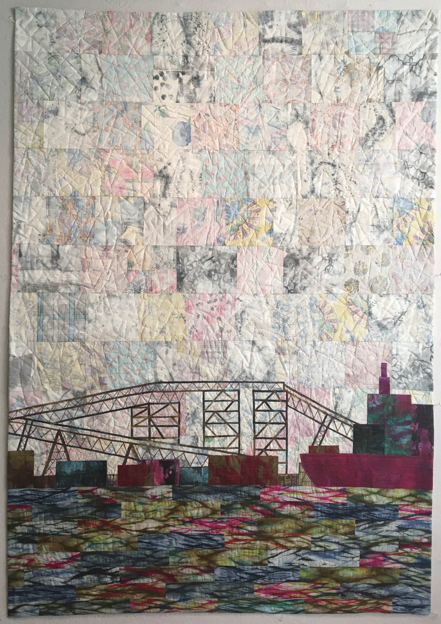 Inspired by images of ships loading and unloading their goods along the north shore of Vancouver Harbour, Susan works with piecing and collage to portray a visually distinct contrast of the Industrial Shoreline.
