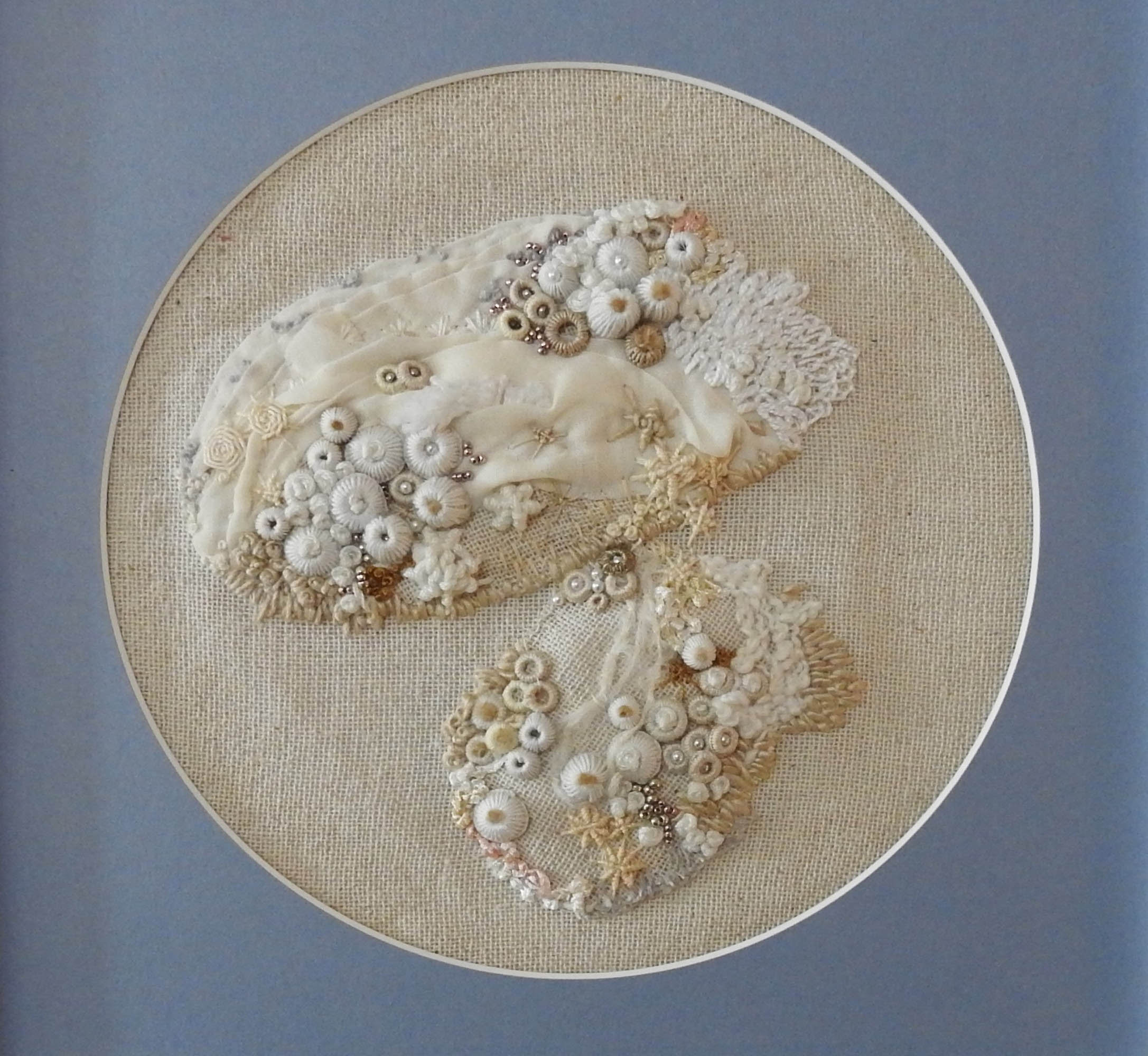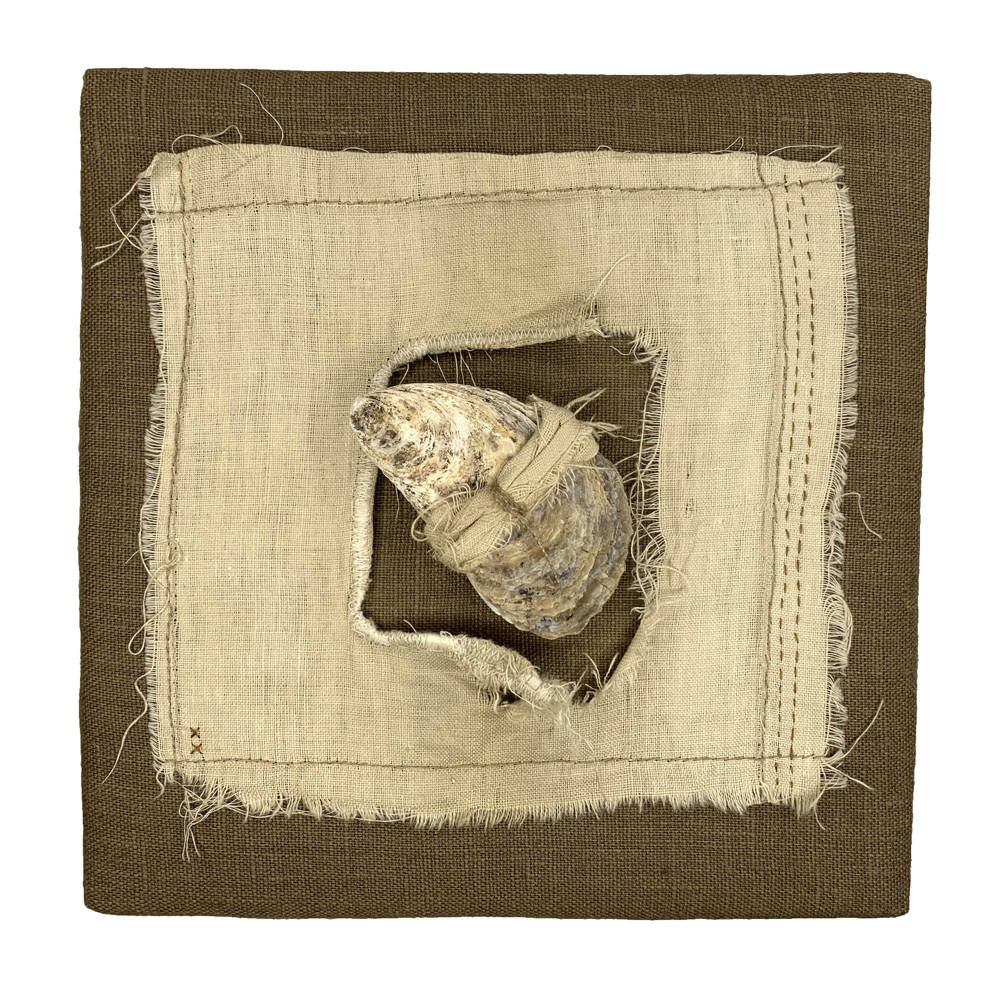 The brittle textures of the antique altar cloth and the crumbling oyster shell testify to the effects of time and pressure in unseen places. Both are emblems of sacred stories of nourishment and provision, spiritual and physical. Held together here, in stitch and fold, what tender stories might they tell?