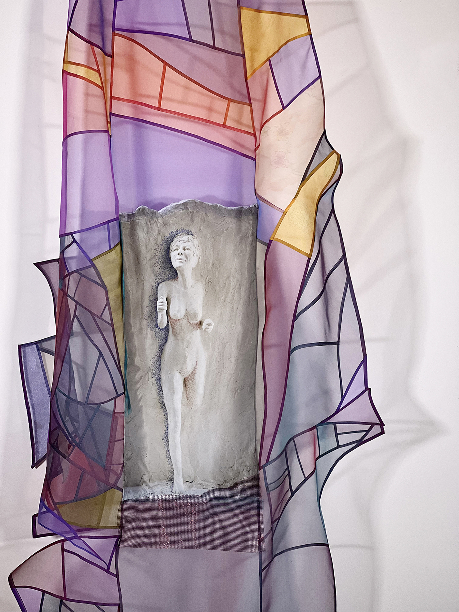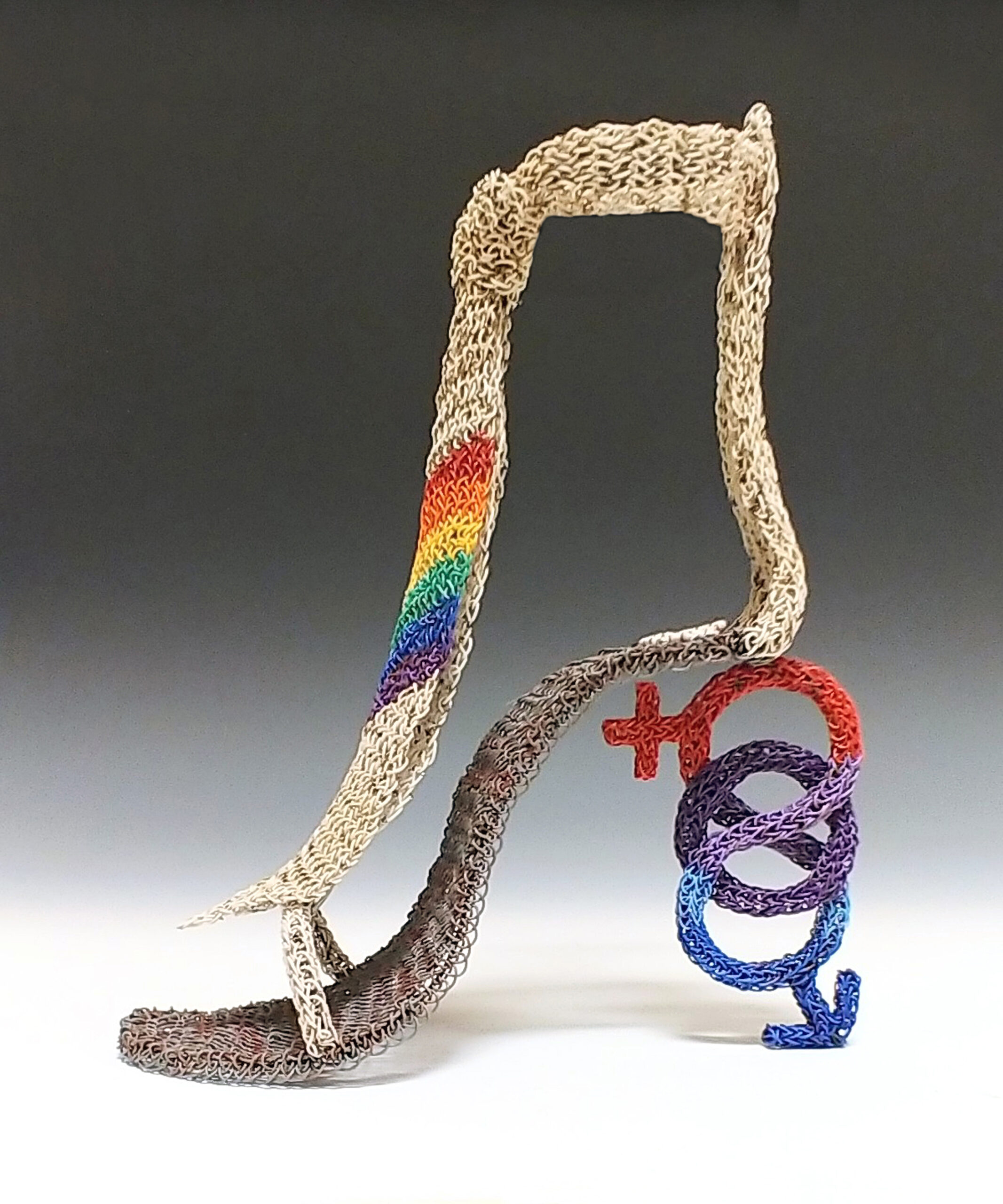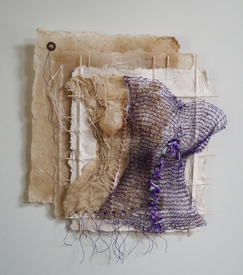 Whatever our challenges as women we hold true to ourselves and protect our freedoms. This is a mixed media work with abaca paper, kozo paper and knitted wire.
