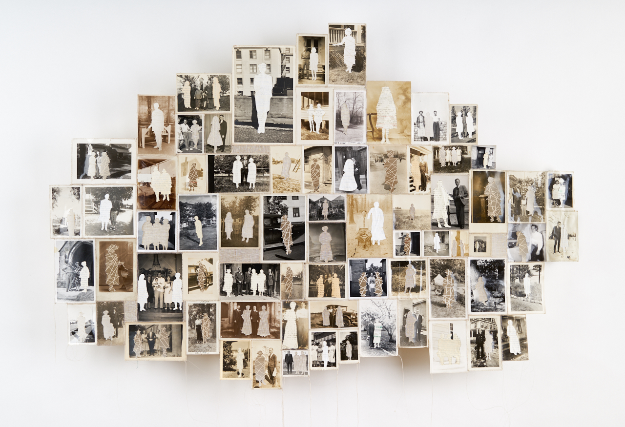 Found photos, thread, mull, selected text pages, aluminum frame [42" x 36" x 3"]
