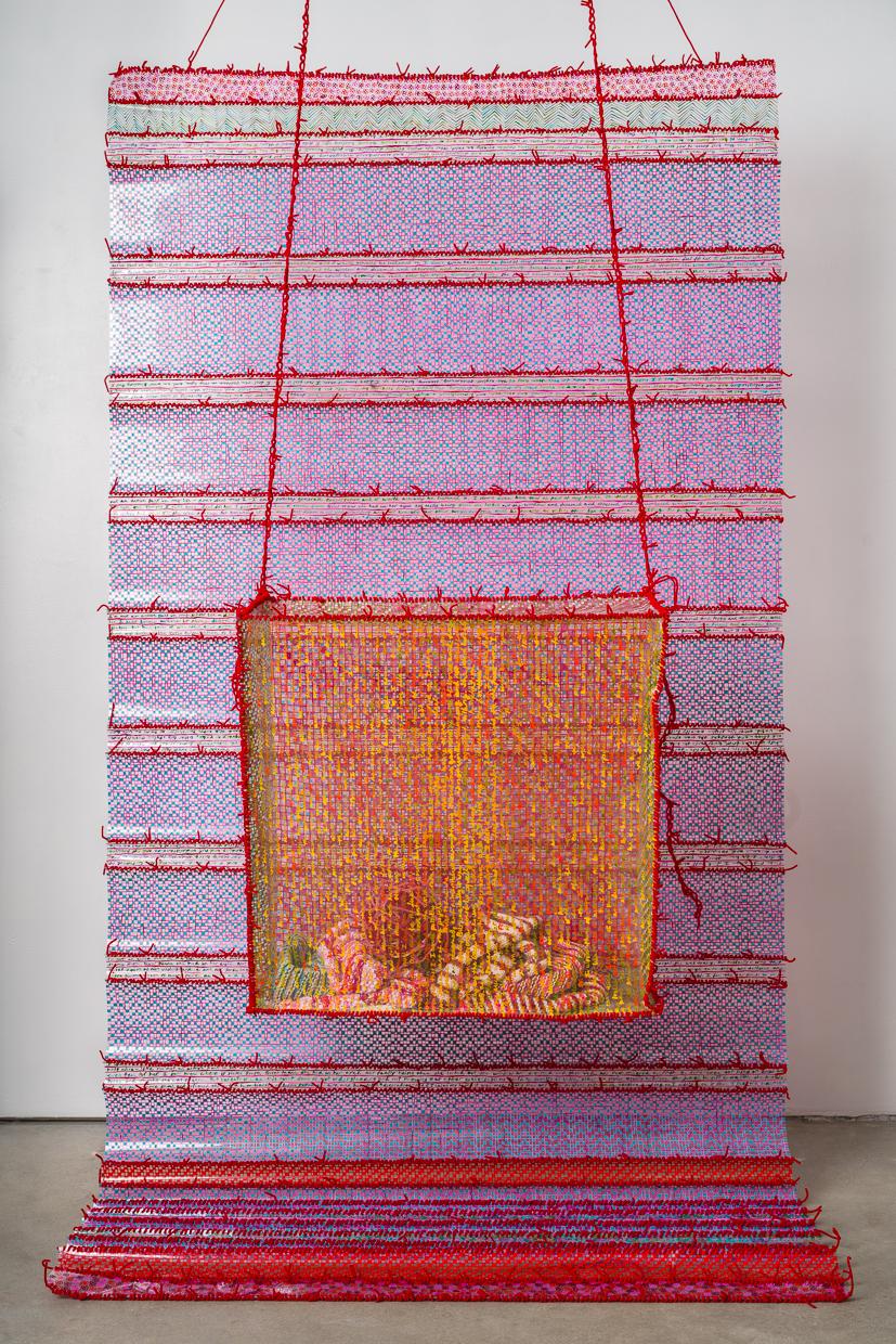 Black metallic yarn, handmade eyelash yarn, black and brown cotton/rayon poly blend fabric, African printed fabric, vintage African fabric wrapped on recycled polyurethane spliced jungle gym rope netting. [79 x 24 x 72 in]