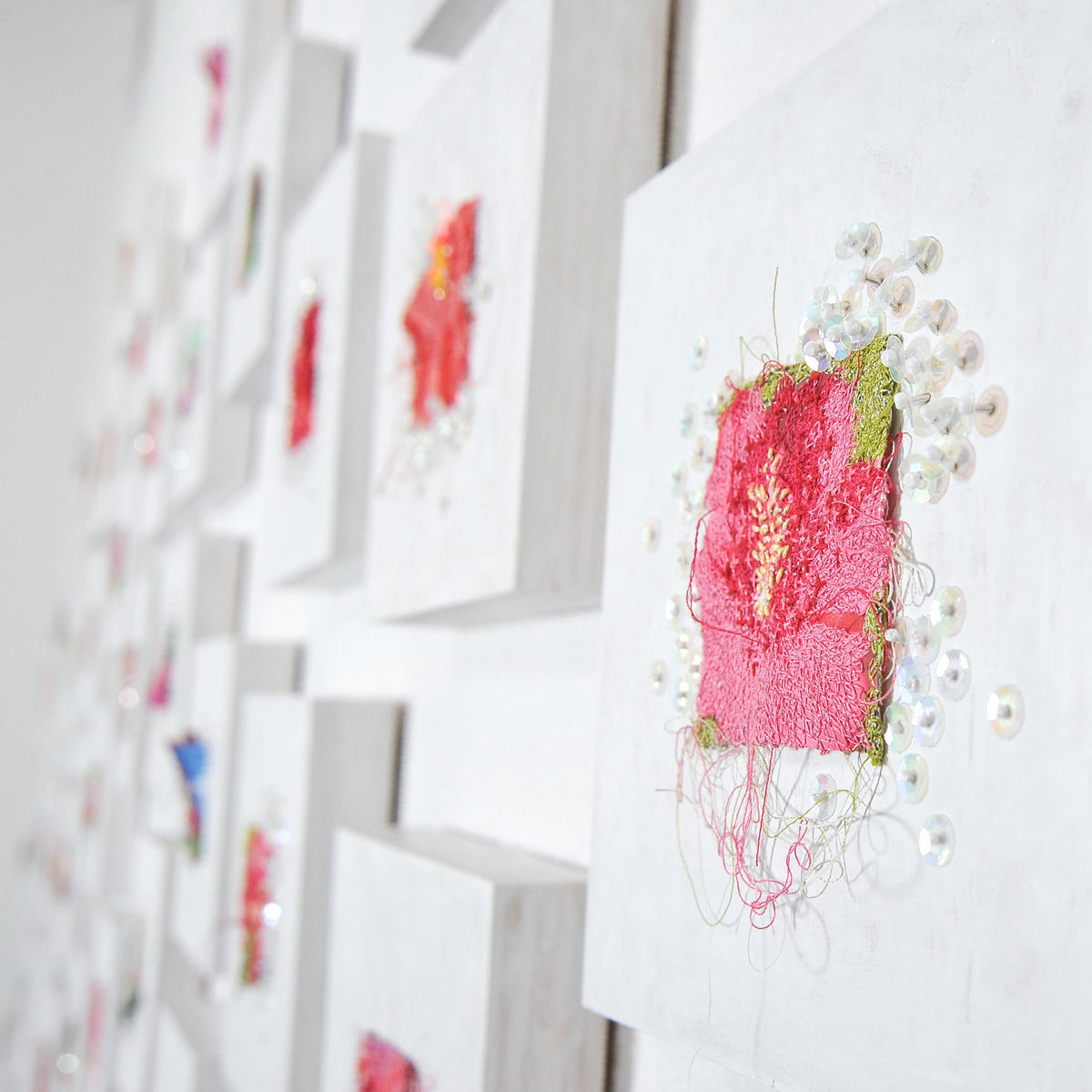 “The Wandering Hibiscus” is my celebration of womanhood. This deeply personal body of artwork stitches together crystalized remembrances of childhood, motherhood, moving, sexuality, aging, and embracing imperfection — panels of vignettes commemorating the memories of an aging woman. Each of these vignettes is composed of a kaleidoscope of threads, sequins, and zippers all tangled together to form a Hibiscus rosa-sinensis. I love the hibiscus as I am drawn firstly to its alluring sensuality. Its ruby, fleshy goodness reminds me to appreciate the simple pleasures in life. In a broader context, the hibiscus symbolizes femininity, warmth, love and passion. The mythology of the flower helps women reclaim their sexuality, vitality, and invincibility in the face of degrading depictions of women in media. I see myself within these descriptors, and have learned to use the flower as a looking-glass into myself. To honor our serendipitous relationship, I began photographing the hibiscus in June 2012 and soon after began sewing on those photographs. From photographs to twisted threads, each vignette is a journey of revelations. I utilized jacked up french knots, misguided sashiko stitches, and jumbled layers of machine stitching to help mend my wounds from womanhood. What began as an unexpected attraction to a flower transformed into a self portrait of sorts; a celebration of a woman in her 50s.