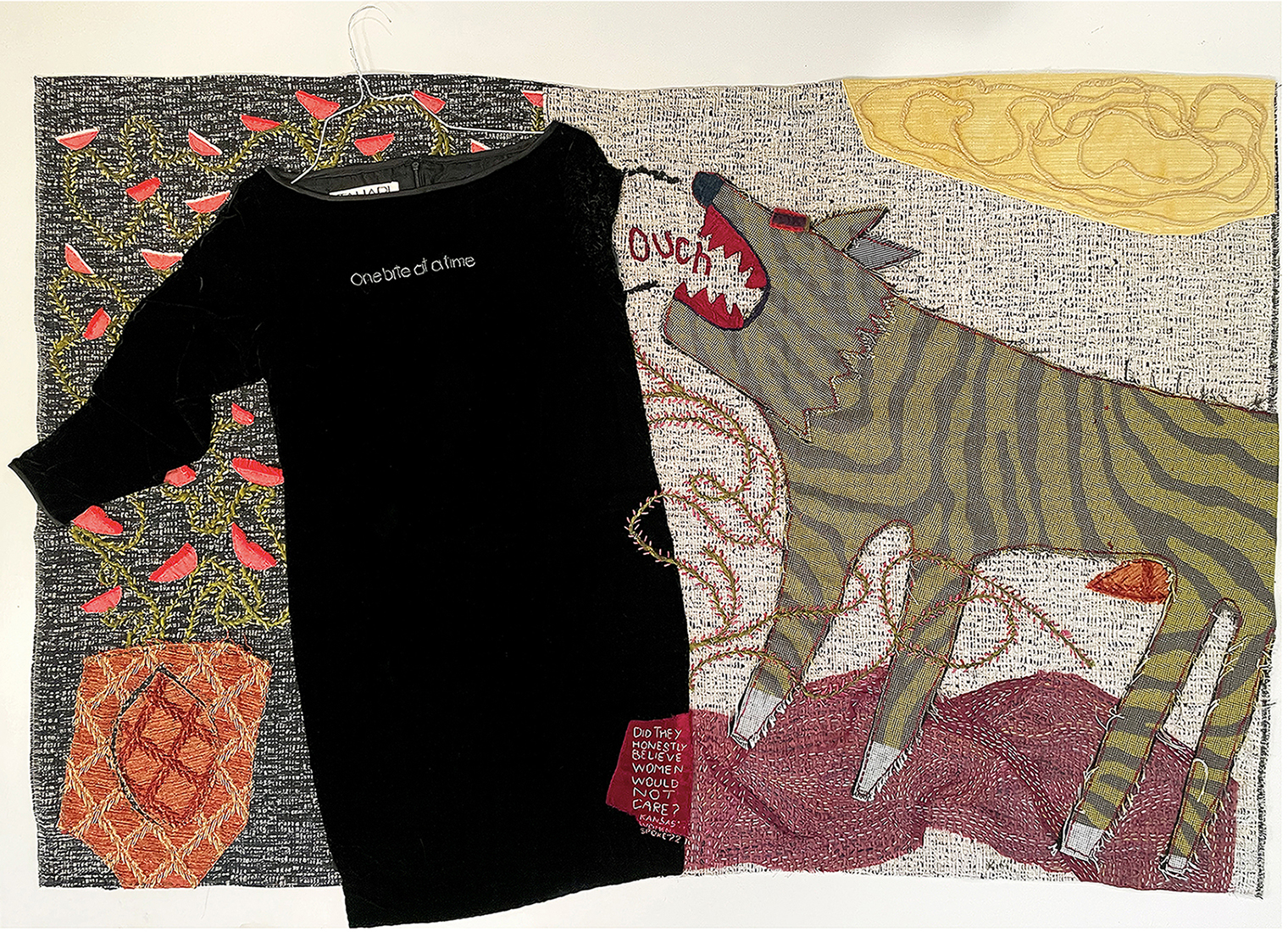 Commercial fabrics, hand stitched with cotton embroidery thread and wool yarn. Coat hanger. [36” x 55.5”]