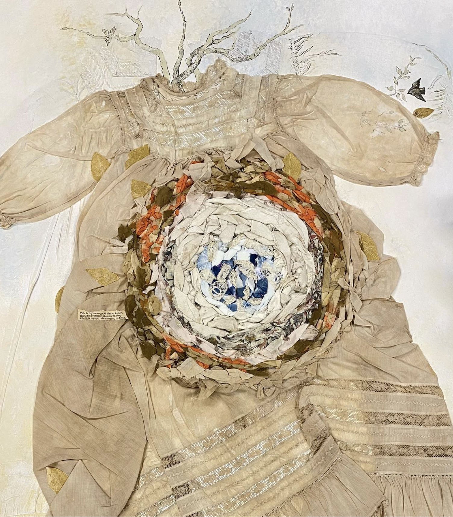Mixed Media of fabric, ink, gouache, nails, gold leaf, rose petals, woodcut [24" x 36”]