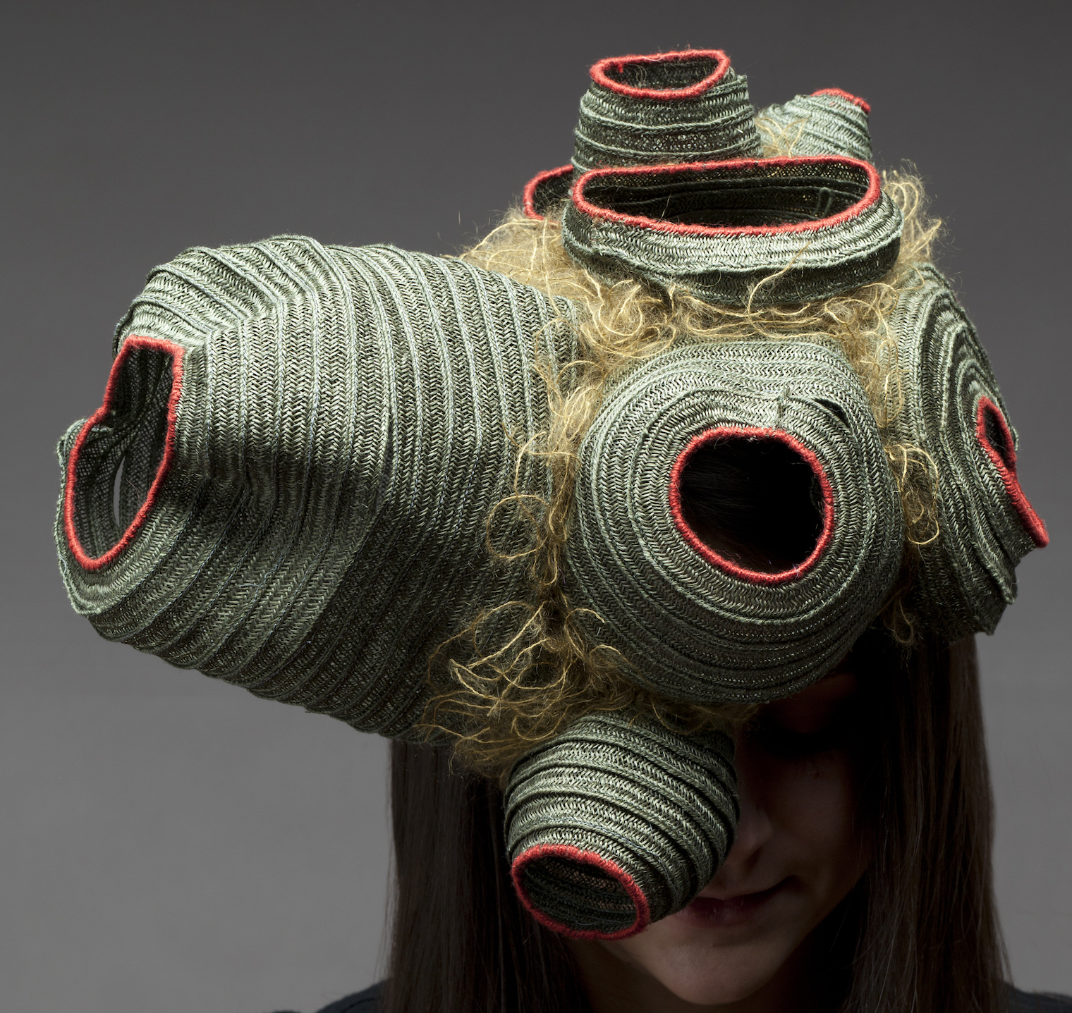 Headwear has long played a role in indicating the class, status and occupation of the wearer - enforcing conformity and erasing individuality. From the 18th century poke bonnet which restricted women's field of vision, to today's hijab, women in particular have been subjugated to fashion dictates and social norms. Colella's headwear sculptures become a vehicle for a subversive coded language which addresses the play between women's visibility and invisibility.