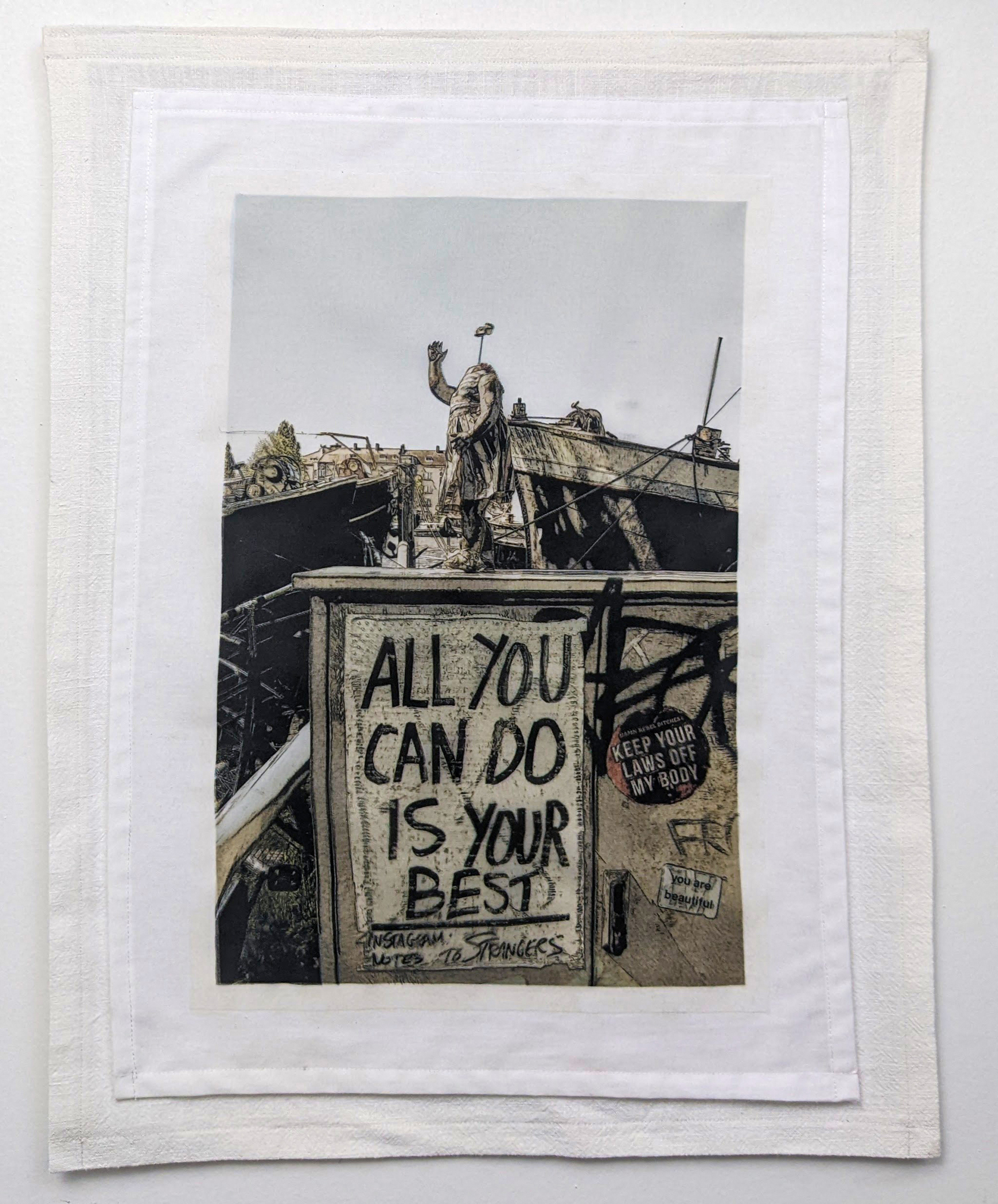 A found doll, it functions as a witness. This doll travels with me; photographing her immersed in different cities forces me to observe the world re-framing my point of view. The streets talk and express the sentiment of its people, their demands, hopes and desires. The piece is created with printed layers of translucent silk organza and cotton fabrics, those layers relate to the layers of graffiti covering the city walls.