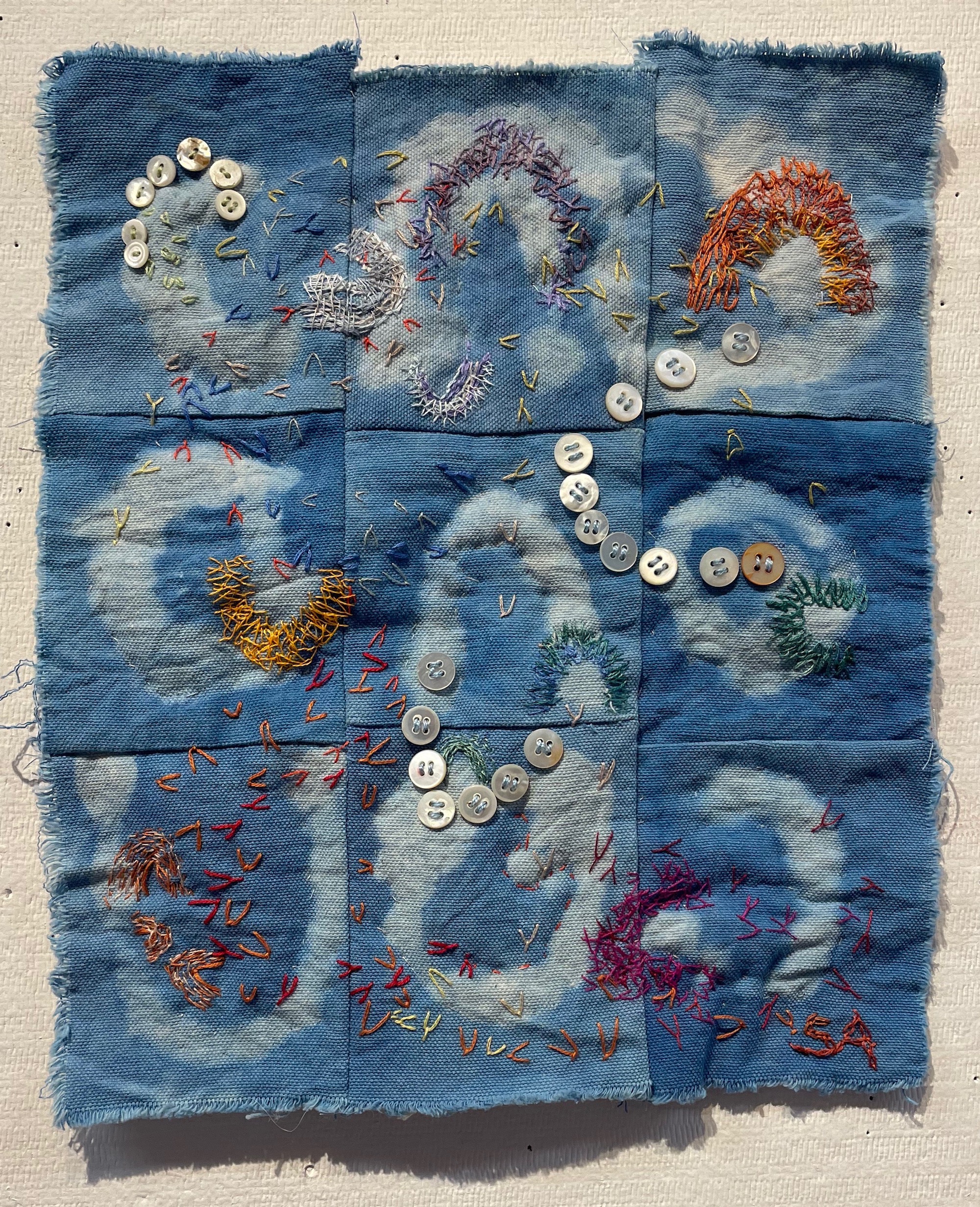 Dyed and sewn canvas, cotton embroidery thread, cotton stuffing and men's shirt buttons (11.5"H x 9.5"W)