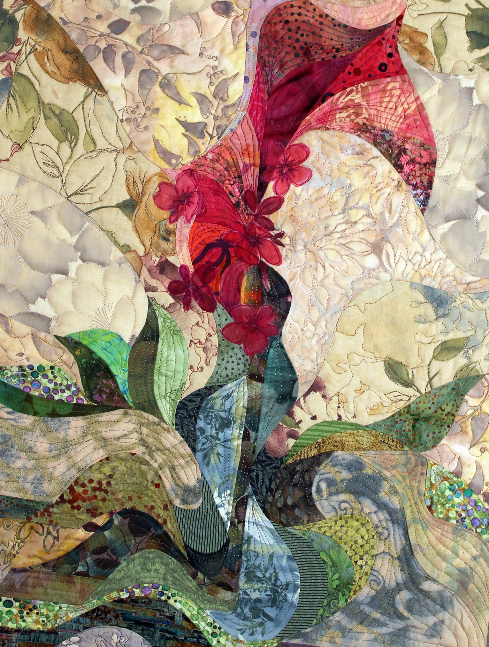 I have done a series of quilts with floral designs. None of them are based on actual flowers, but the shapes, colors and background all send the message that this is a flower of some kind. This floral form is exotic, reminiscent of a cactus and a total figment of my imagination. www.judydales.com