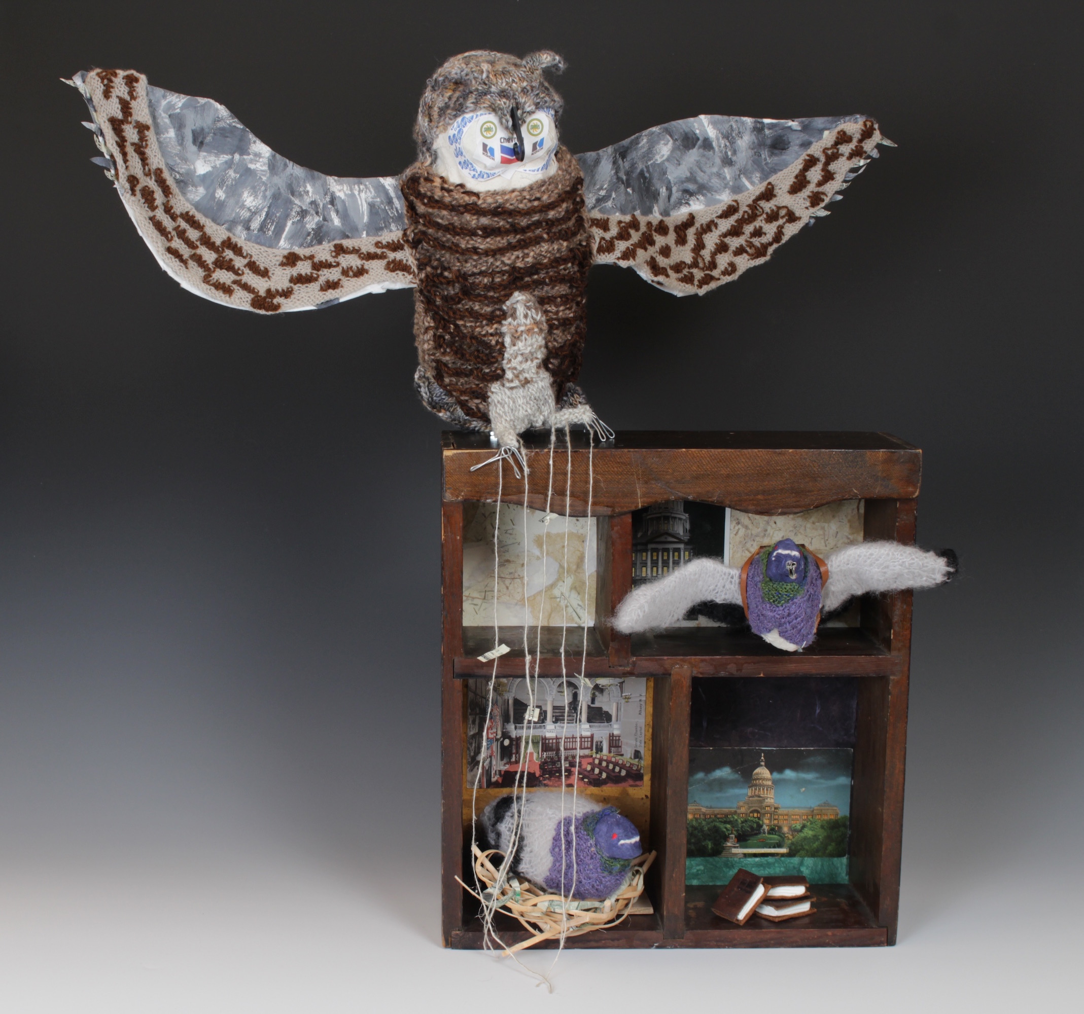 Wood knick knack shelf, yarn, mulberry paper, vintage postcards, canvas, acrylic paint, reed, U.S. currency, printed distorted corporate logos, wire, leather, metal clip, stone clay (26"H x 26"W x 10"D)