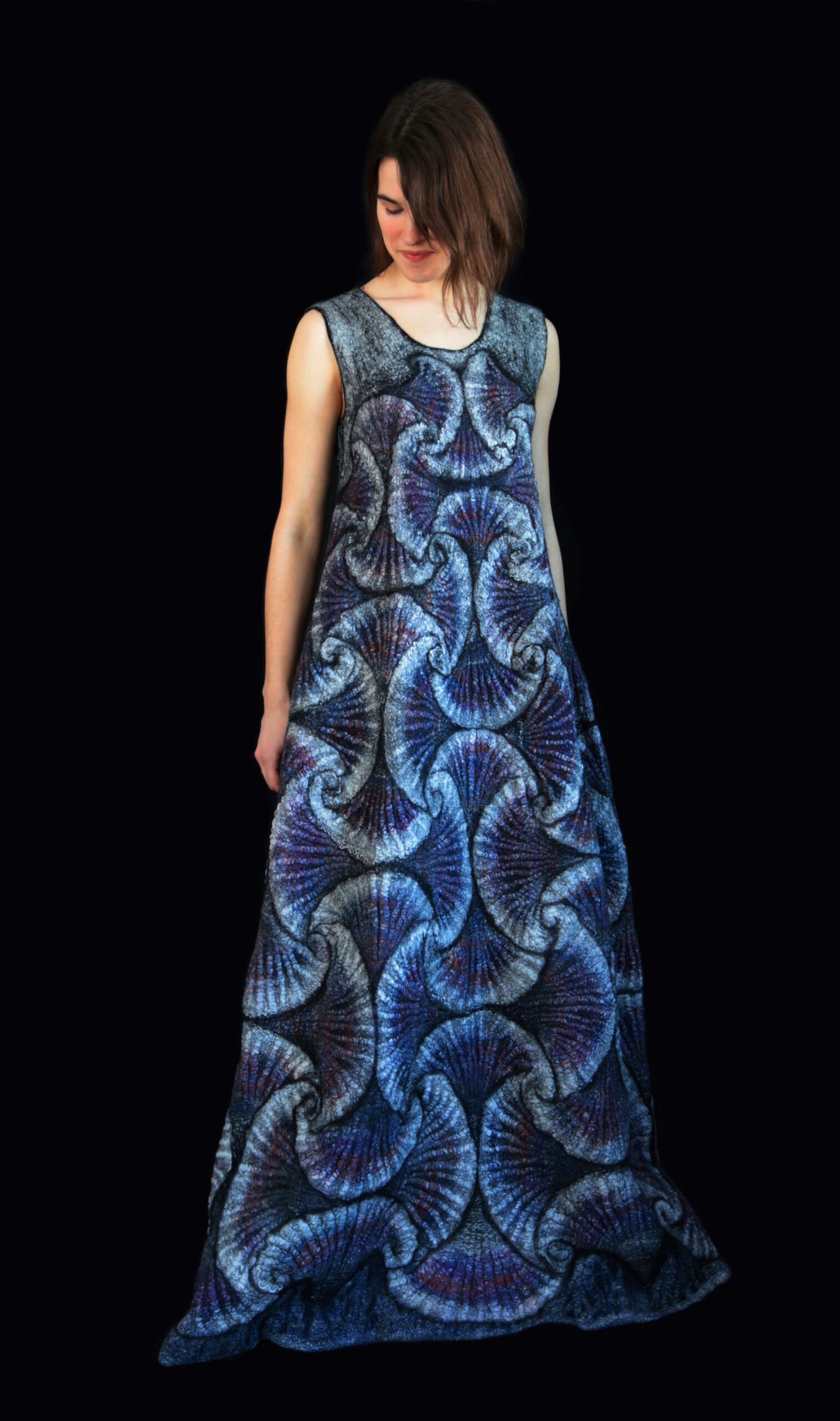 This is a 3-D hollow form that was practically sculpted and assembled from a multitude of hand-twisted felt ropes. There is no fabric involved, only wool and plant fiber comprising multiple small parts that are constructed together on a durable base layer, and a surface made of plant-derived fiber (Ramie roving). The form of a wearable sculpture shows the multifaceted structure of the surface from all sides, with the scale of the motifs changing with the proportions and curves of the body. I created large pieces to amplify this visual effect; when this “marriage” of elements is in motion, all parts appear to come to life, existing in their structure. The attachment to the human body in this format is also a metaphor. It is our melding back into our surrounding system from which we initially sprang, maybe to correct the trajectory of our future and find our place there. These nettle cocoon dresses or giant shells are a place of cover or safety, where we find ourselves and our awareness of modern reality, where we can hopefully determine a better direction. www.feuer-und-wasser.com