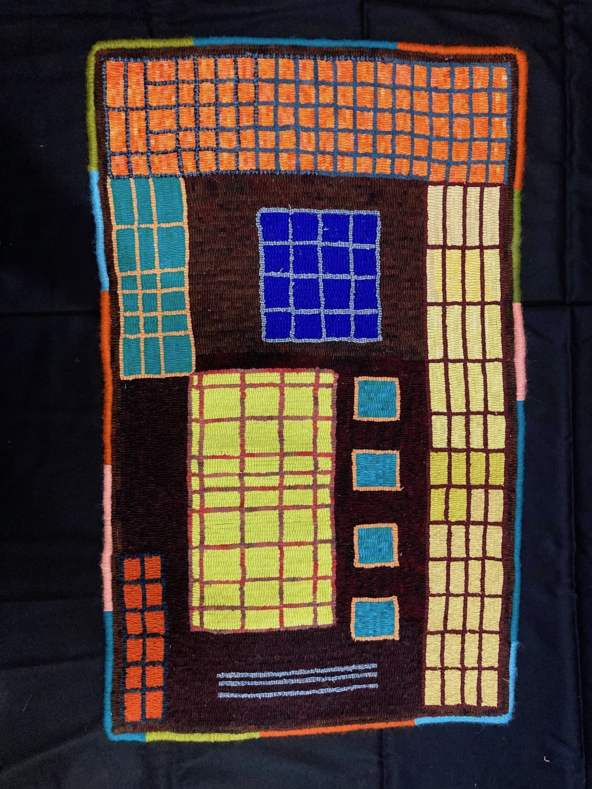 This hooked piece was done to express the anxiety brought on during the "lock down". The grid restrained the colors that represented the life we wanted to resume. But, some of the irregularity in the shapes helped give the prospect of escape. There is much "Hidden Meaning" in our art. www.redbarnrugs.com