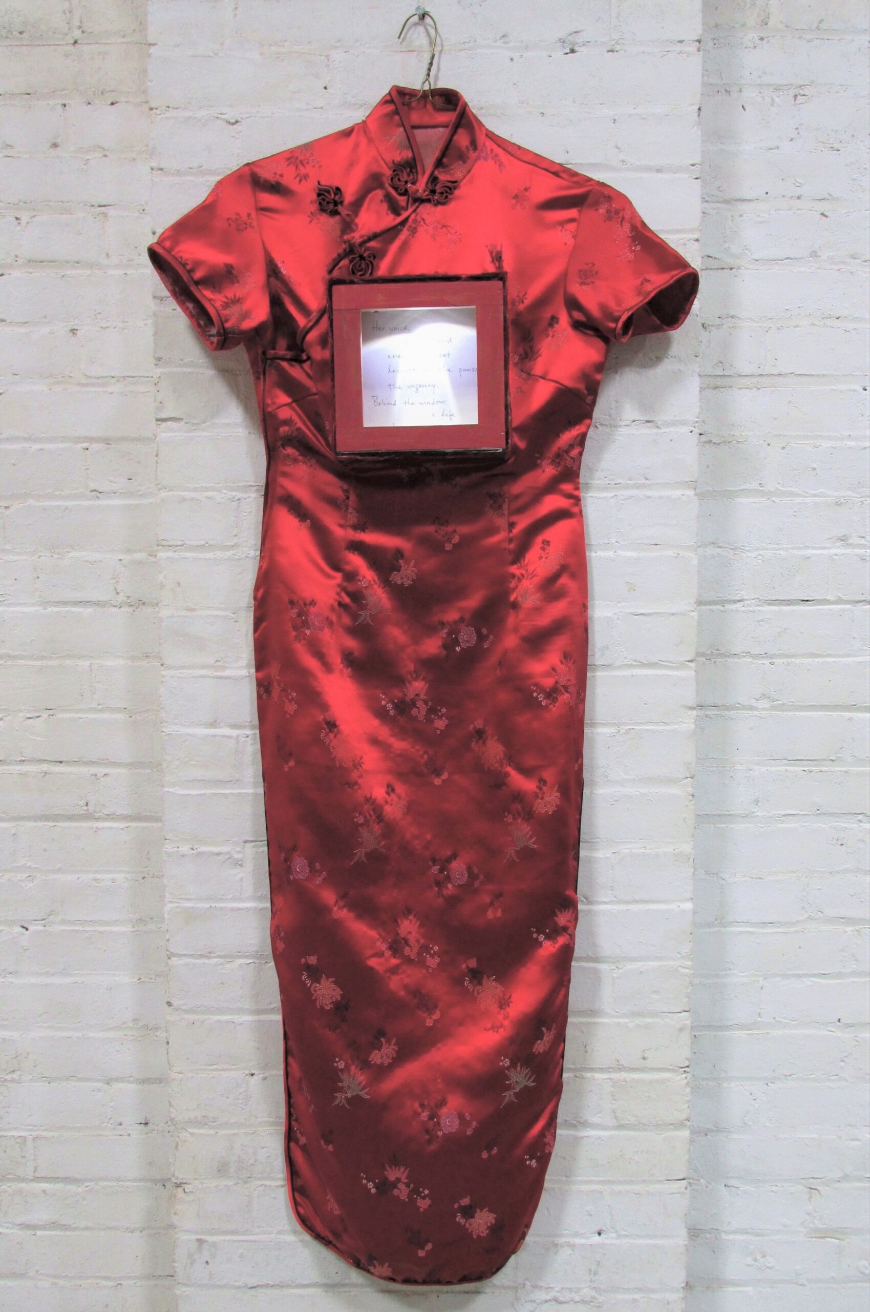Red satin dress, painted wooden light box, handwritten poem, wrapped coat hanger (54"H x 36"W x 3"D)