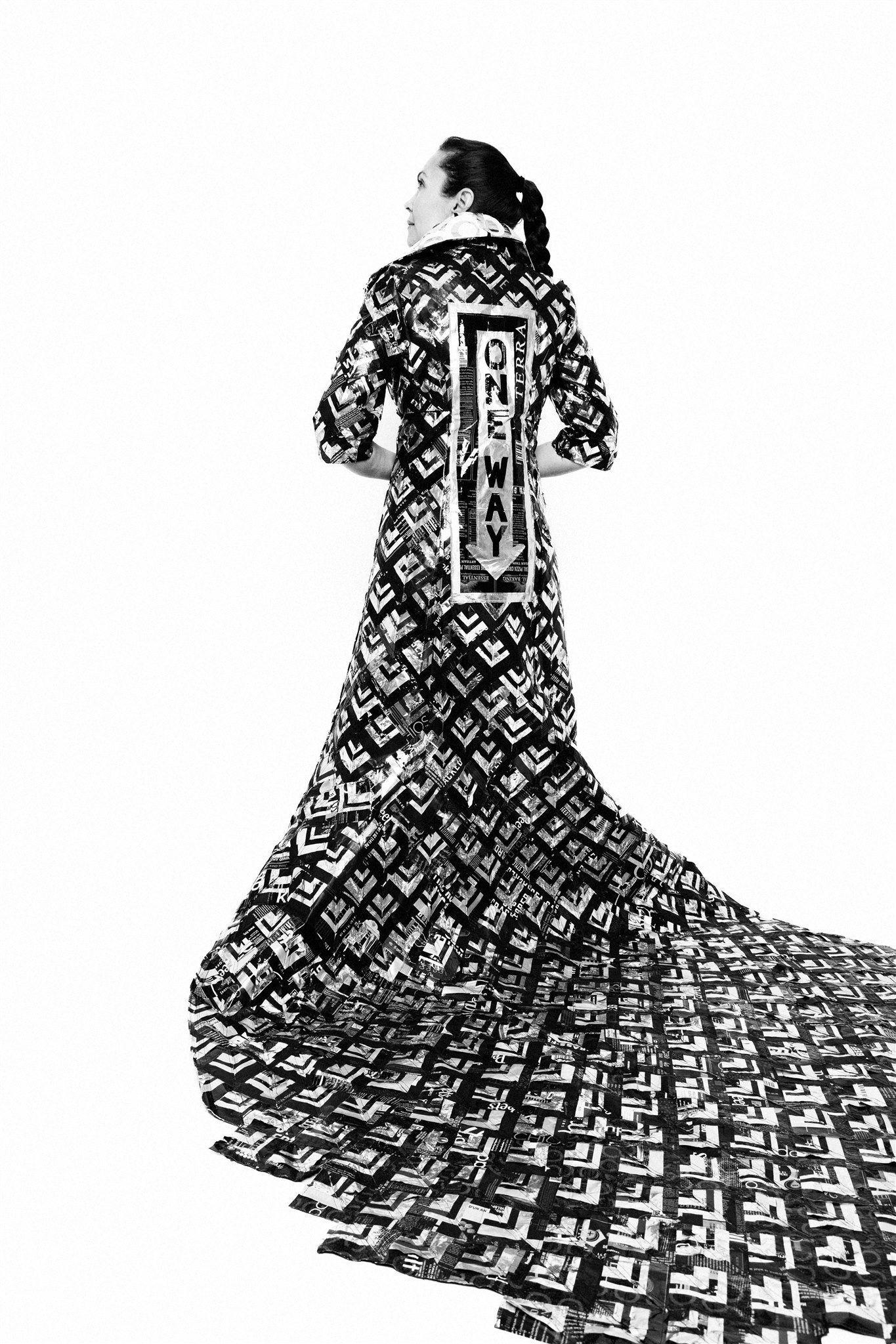 This quilted jacket is made from rescued single-use plastic trash and second-hand fabric. The intricate pattern devolves at the end of the 6-foot long train into tatters, pointing out that whether we use plastic for 5 seconds or 50 years, it's all a One Way Street street to trash.
